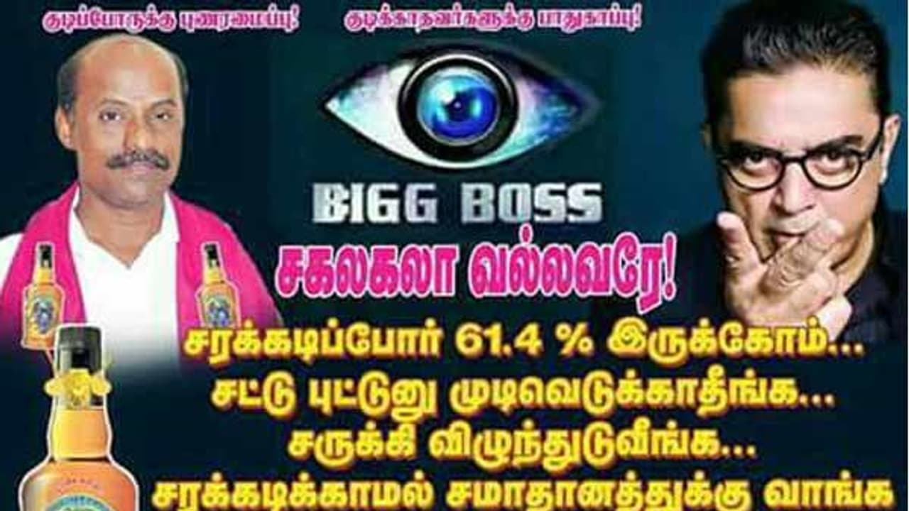 இந்த நிலையில், மது குடிப்போர் விழிப்புணர்வு சங்கம் சார்பில், நடிகர் கமல்ஹாசனுக்கு வித்தியாசமான போஸ்டர் ஒன்றை அடித்து இருக்கிறது. அந்த போஸ்டரில், கமலின் அரசியல் பிரவேச அறிவிப்பை கிண்டல் செய்யும் விதமாக அதில் அச்சிடப்பட்டுள்ளது. போஸ்டரில், பிக் பாஸ் சகலகலா வல்லவரே! ''சரக்கடிப்போர் 61.4 சதவிகிதம் இருக்கோம். சட்டுபுட்டுன்னு முடிவெடுக்காதீங்க.. சருக்கி விழுந்துடுவீங்க... சரக்கடிக்காமல் சமாதானத்துக்கு வாங்க... சரியான முடிவு சொல்றோம் 61.4% என்று அச்சிடப்பட்டுள்ளது.
