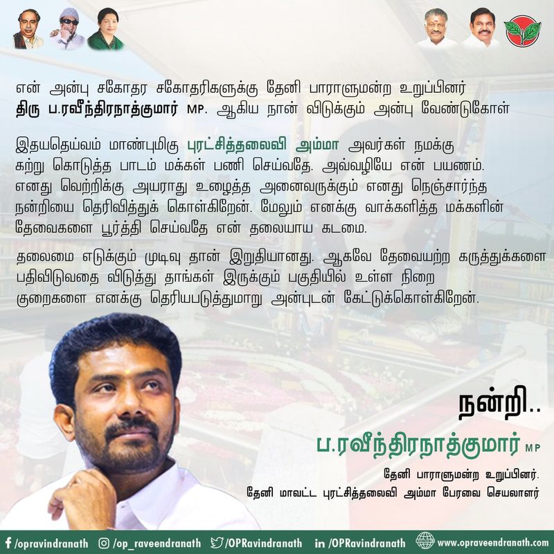 இந்நிலையில் ஓ.பி.ஆர்.ரவிந்திர நாத் குமார் தனது ட்விட்டர் பக்கத்தில் வெளியிட்டுள்ள பதிவில், ’’ஜெயலலிதா நமக்கு கற்றுக் கொடுத்த பாடம் மக்கள் பணி செய்வதே. அவ்வழியே என் பயணம். எனது வெற்றிக்கு அயராது உழைத்த அனைவருக்கும் எனது நெஞ்சார்ந்த நன்றியை தெரிவித்துக் கொள்கிறேன். எனக்கு வாக்களைத்த மக்களின் தேவைகளை பூர்த்தி செய்வதே என் கடமை.