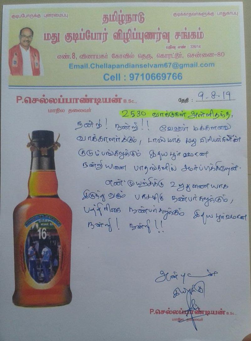 வேலூர் ஓட்டுகளை வாரி வழங்கிய மக்களுக்கு மது குடிப்போர் சங்கத் தலைவர் செல்ல பாண்டியன் நன்றியை வாரி வழங்கியிருக்கிறார்.