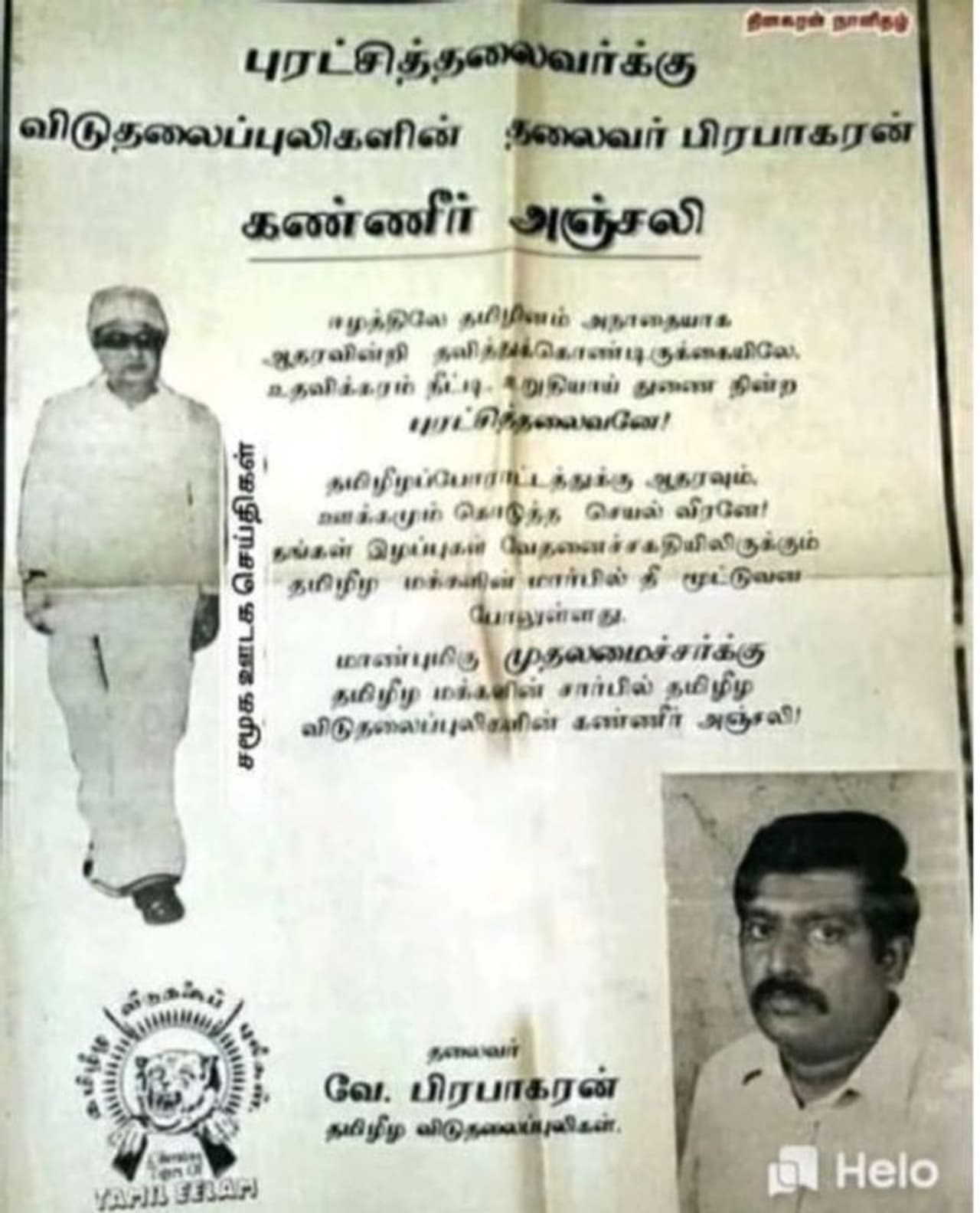 தமிழீழப்போராட்டத்துக்கு ஆதரவு,, ஊக்கமும் கொடுத்த செயல்வீரனே தங்கள் இழப்புகள் வேதனைச் சகதியிலிருக்கும் தமீழ மக்களின் மார்பில் தீ மூட்டியதை போல் உள்ளது’’என தமிழகத்தில் வெளியான அனைத்து நாளிதழ்களிலும் விளம்பரம் வெளியிட்டிருந்தார் விடுதலை புலிகள் தலைவர் பிரபாகரன்.