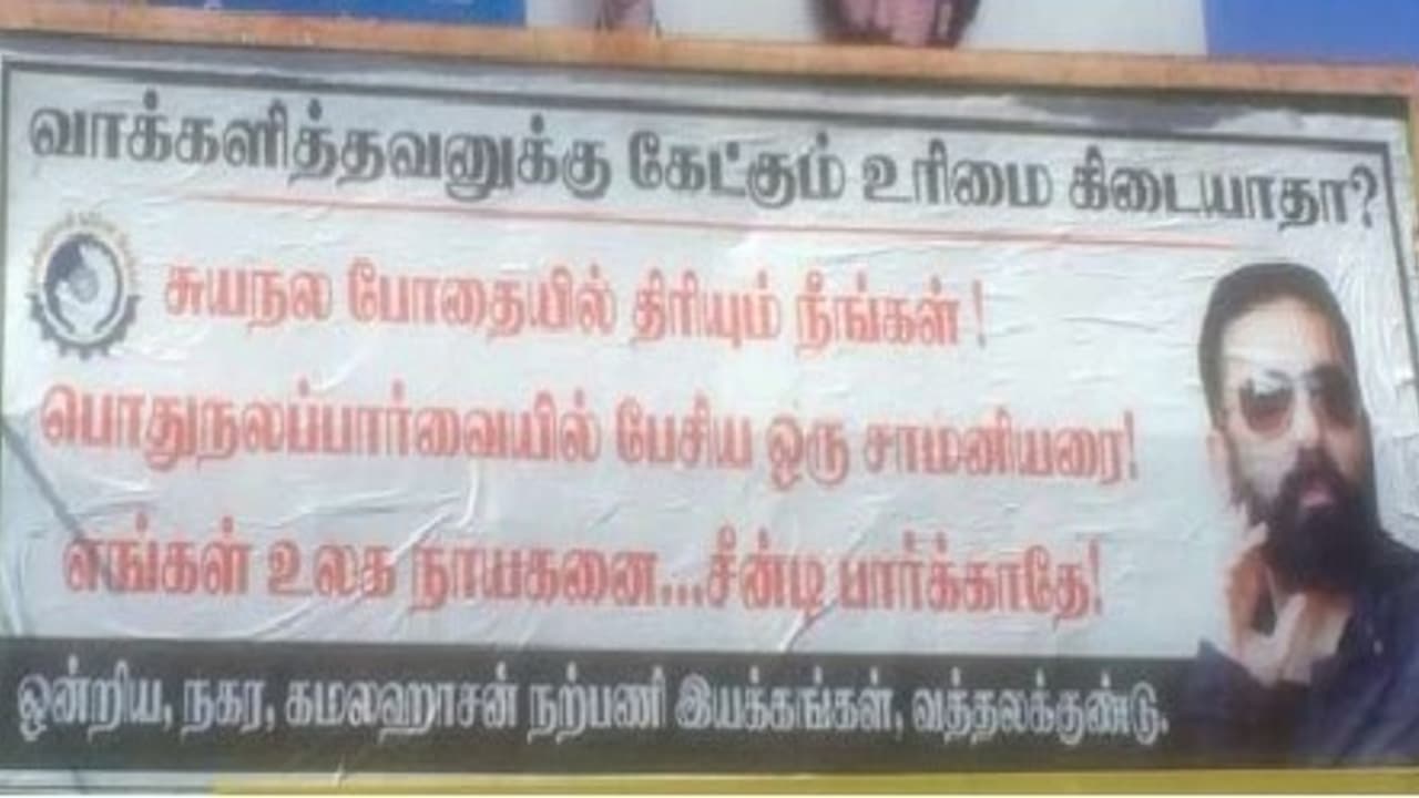 திண்டுக்கல் மாவட்டம், வத்தலகுண்டுவில் நடிகர் கமல் ஹாசன் ரசிகர்கள் சார்பில் இந்த போஸ்டர் ஒட்டப்பட்டுள்ளது. போஸ்டரில், வாக்களித்தவனுக்கு கேள்வி கேட்கும் உரிமை கிடையாதா? சுயநலபோதையில் திரியும் நீங்கள் பொதுநலப் பார்வையில் பேசிய ஒரு சாமானியரை உலக நாயகனை சீண்டிப் பார்க்காதே என்று கூறப்பட்டுள்ளது.