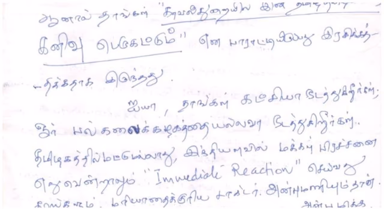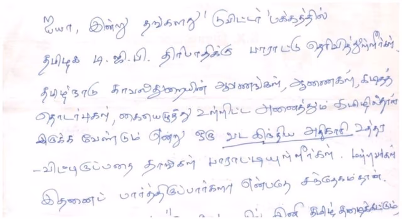 இதுதொடர்பாக தன்னுடைய ஃபேஸ்புக் பக்கத்தில் டாக்டர் ராமதாஸ், ஒரு கடித்தத்தை பதிவிட்டுள்ளார். அந்தக் கடிதத்தில், 'ஐயா, இன்று தங்களது டுவிட்டர் பக்கத்தில் தமிழக டிஜிபி திரிபாதிக்கு பாராட்டு தெரிவித்துள்ளீர்கள். தமிழ் நாடு காவல் துறையின் ஆவணங்கள், ஆணைகள், கடிதத் தொடர்புகள். கையெழுத்து உள்ளிட்ட அனைத்தும் தமிழில்தான் இருக்க வேண்டும் என்று ஒரு வட இந்திய அதிகாரி உத்தரவிட்டிருப்பதை தாங்கள் பாராட்டியுள்ளீர்கள். மற்றவர்கள் இதனைப் பார்த்திருப்பார்களா என்பதே சந்தேகம்தான். ஆனால், தாங்கள் ‘காவல்துறையில் இனி தமிழ் தழைக்கட்டும் கனிவு பெருகட்டும்’ எனப் பாராட்டியிருப்பது ரசிக்கத்தக்கது.