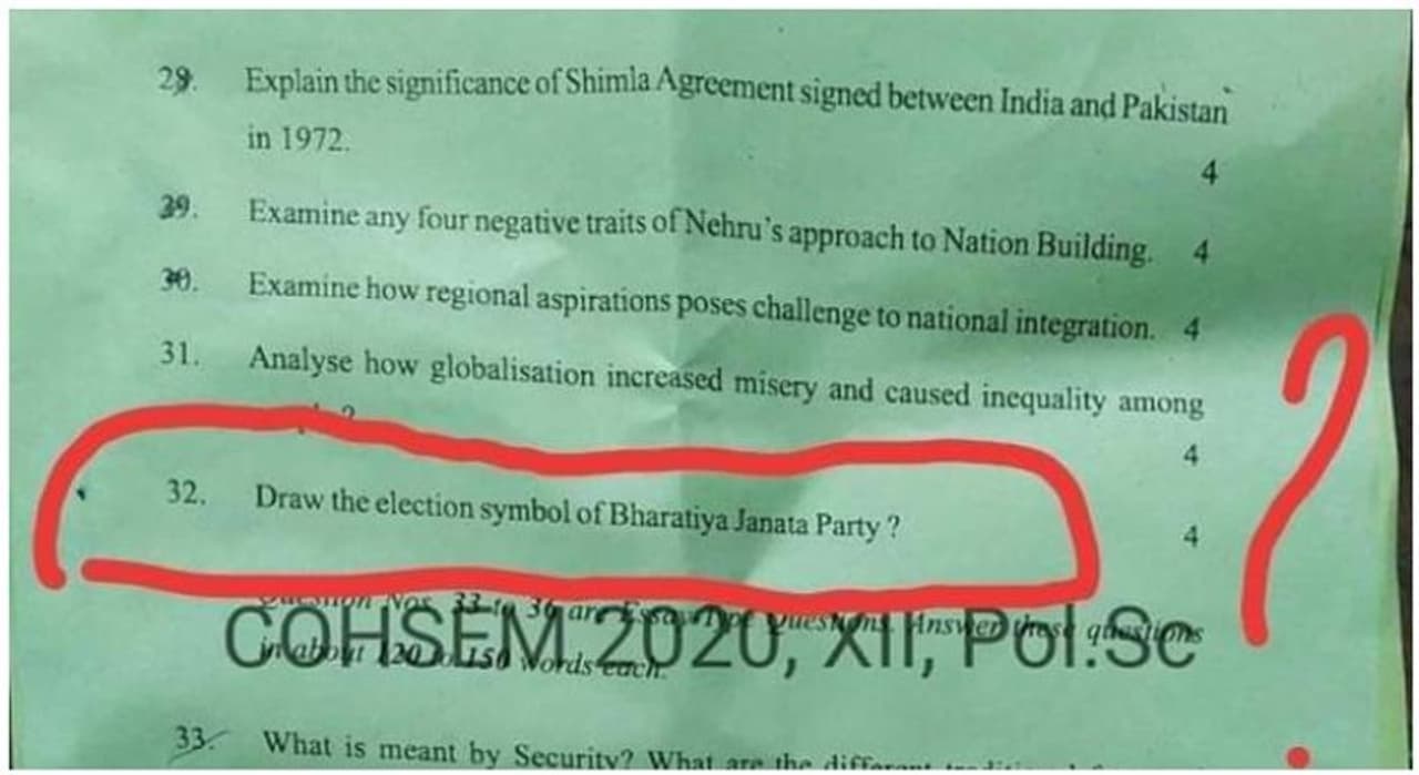 மணிப்பூரில் பிளஸ் டூ பொதுத்தேர்வுகள் நடைபெற்றுவருகின்றன. கடந்த 22-ம் தேதி அரசியல் அறிவியல் பாடத்துக்கான தேர்வு நடைபெற்றது. இதில் 4 மதிப்பெண் பகுதியில், ‘பாரதிய ஜனதா கட்சியின் தேர்தல் சின்னத்தை வரைக’ என்று கேள்வி கேட்கப்பட்டிருந்தது. இந்த விஷயம் 12ம் வகுப்பு தேர்வு எழுதிய சகோதரியின் வினாத்தாளை இம்பாலைச் சேர்ந்த ஒருவர் ட்விட்டர் பக்கத்தில் பகிர்ந்தார்.