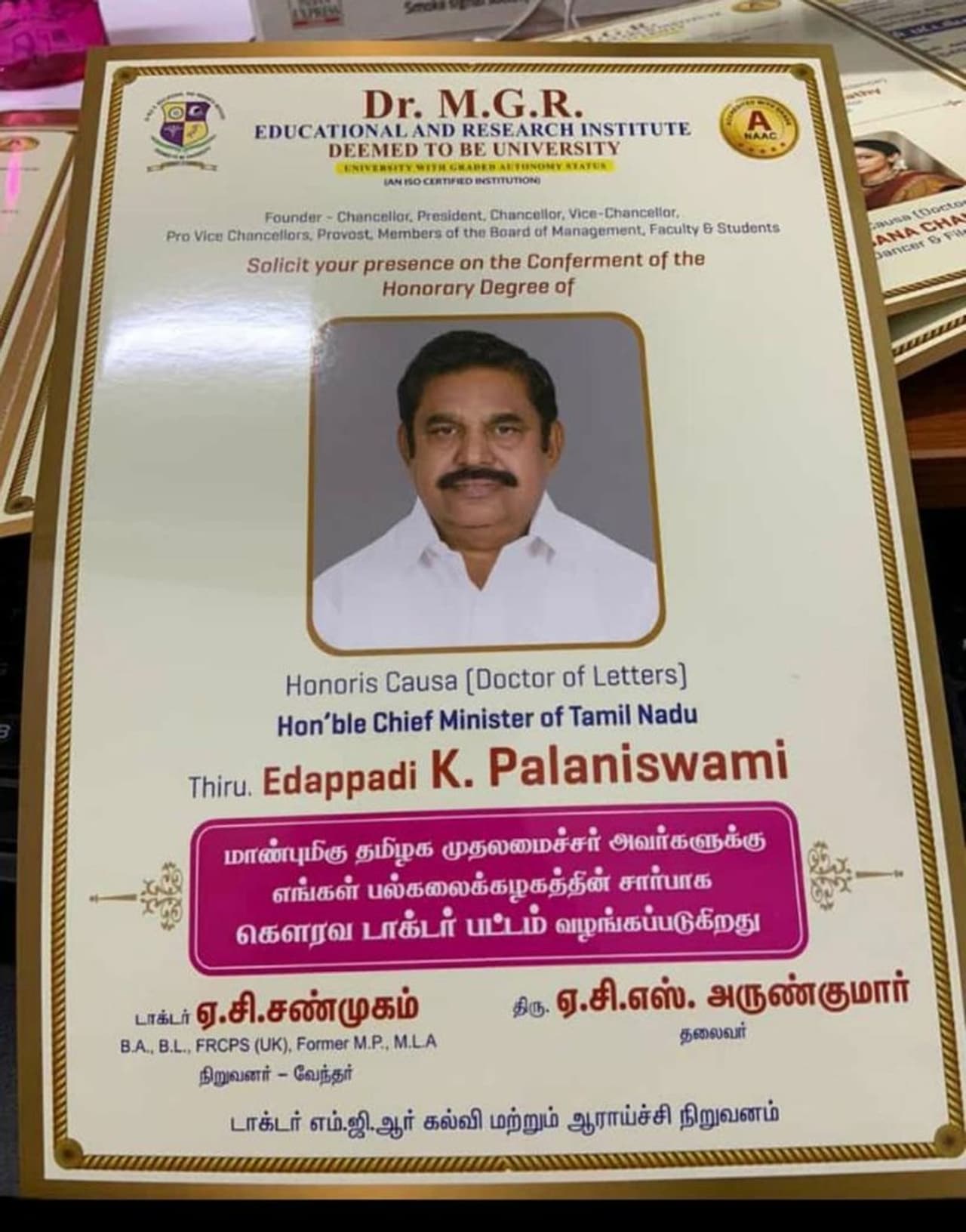 அந்த வரிசையில் முதல்வர் எடப்பாடி பழனிச்சாமிக்கு கௌரவ டாக்டர் பட்டம் வழங்கப்பட உள்ளதாக எம்.ஜி.ஆர் நிகர்நிலை பல்கலைக்கழகம் அறிவித்துள்ளது. அக்டோபர் 20-ம் தேதி இந்த கௌரவ பட்டம் வழங்கப்படும் என அந்நிறுத்தின் தலைவர் மற்றும் வேந்தர் ஏ.சி.சண்முகம் அறிவித்துள்ளார். டாக்டர் ஏ.சி.சண்முகம் சமீபத்தில் நடைபெற்ற வேலூர் நாடாளுமன்ற இடைத்தேர்தலில் அதிமுக கூட்டணி ஆதரவில் போட்டியிட்டு சொற்ப வாக்குகளில் தோல்வியடைந்தார். இந்நிலையில், உள்ளாட்சி மன்ற தேர்தலில் அதிமுக சார்பாக வேலூர் மாநகர மேயர் வேட்பாளராக களமிறக்கப்படலாம் என்று கூறப்படுகிறது.