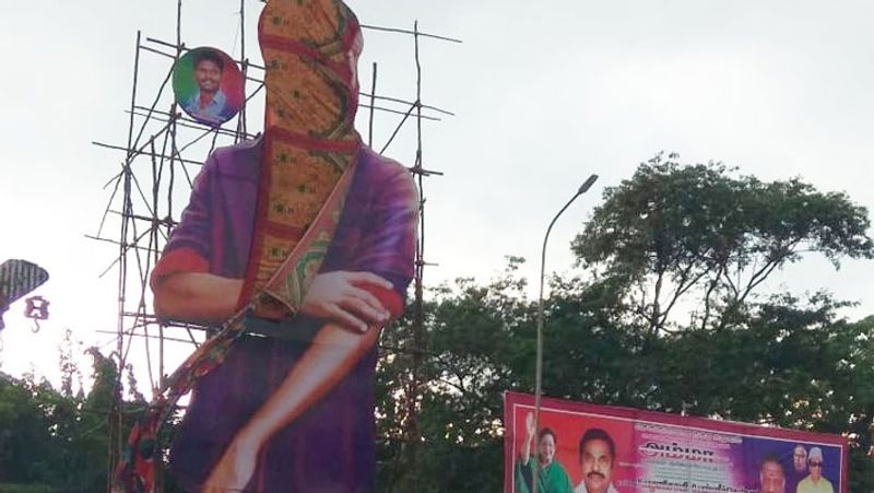 இதைப் பொறுக்காத சிலர் மாமண்டூர் பகுதியில் வைக்கப்பட்டிருந்த தனுஷின் கட் அவுட்டை சில புடவைகளைக் கொண்டு மூடி மறைத்துள்ளனர்.