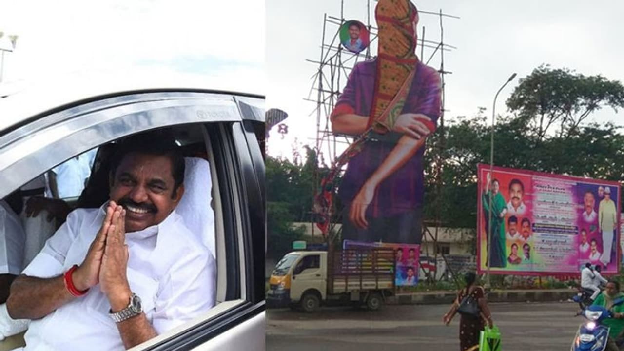 நான்கு வழி தேசிய நெடுஞ்சாலையில் நிறுவப்பட்டிருந்த சிலையைத் திறக்க எடப்பாடி மதியம் அங்கு வந்தார். நிகழ்ச்சி நடந்துகொண்டிருந்தபோது எதிர்ப்புரத்தில் தெரிந்த காட்சியை பார்த்த நிருபர்கள் மற்றும் சினிமா ரசிகர்கள் அதிர்ச்சி அடைந்தனர். பிரபல நடிகரும், சூப்பர் ஸ்டார் ரஜினிகாந்தின் மருமகனுமான தனுஷ் நடிப்பில் ‘வட சென்னை’ படம் வெளியாகி சக்கைப்போடு போடுகிறது. இந்தப்படம் இன்று ரிலீஸ் என்பதால் தனுஷ் ரசிகர்கள் தமிழகம் முழுவதும் கட் அவுட்டுகள் போஸ்டர்கள் மற்றும் பேனர்கள் வைத்து மகிழ்ந்து வருகின்றனர்.