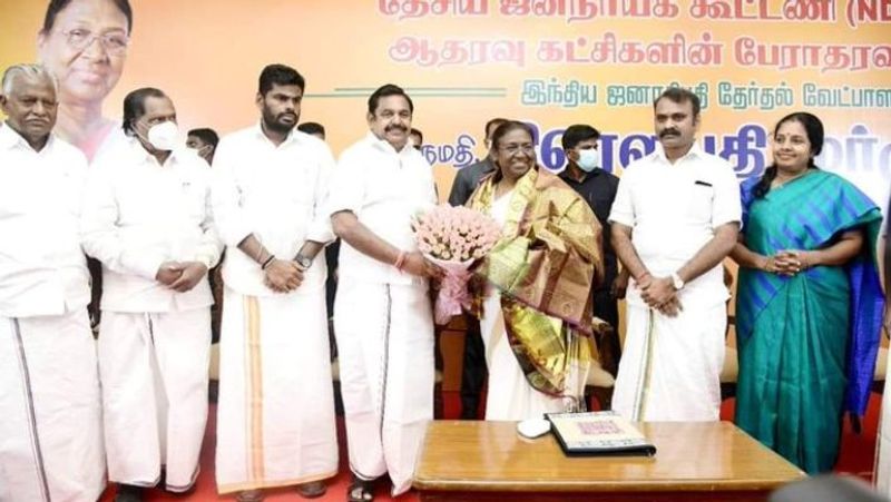 எடப்பாடி பழனிசாமி பேசிய போது, ‘பழங்குடியினத்தைச் சேர்ந்தவர் குடியரசு தலைவராக வருவது பெருமைக்குரியது. அதிமுகவைப் பொருத்தவரை பொதுக்குழுவுக்கே உச்சபட்ச அதிகாரம். பொதுக்குழு எடுத்த முடிவுக்கு ஓ.பன்னீர்செல்வம் கட்டுப்பட்டிருக்க வேண்டும். ஓ.பன்னீர்செல்வத்தின் இன்றைய நிலைக்கு அவர்தான் காரணம். நாங்கள் இல்லை. பொதுக்குழுவுக்கு ஓ.பி.எஸ் கட்டுப்பட்டிருந்தால், இன்று திரௌபதி முர்முவை தனியாக சந்திக்கும் நிலை ஏற்பட்டிருக்காது’ என்று கூறினார்.