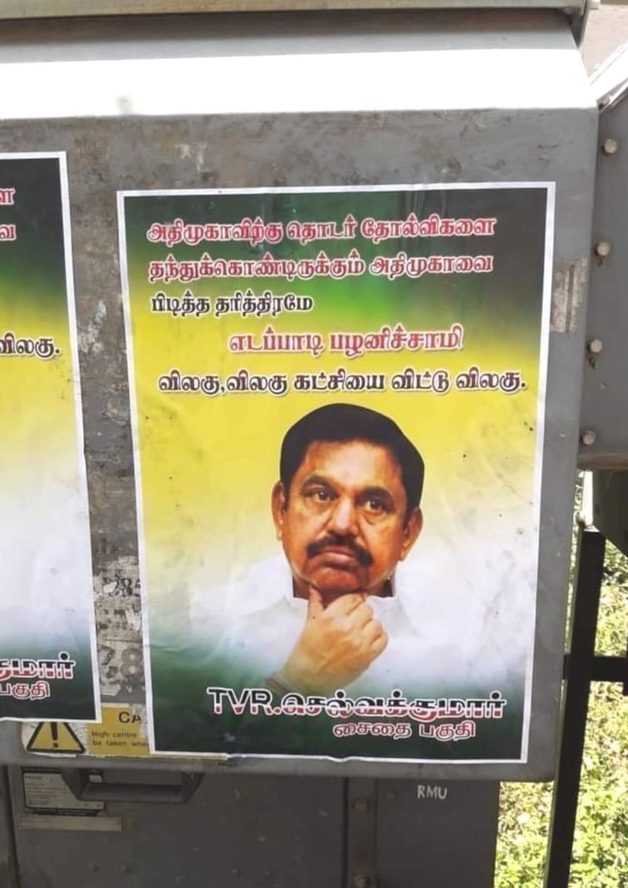 அதில், ‘அதிமுகவுக்கு தொடர் தோல்விகளை தந்து கொண்டிருக்கும் அதிமுகவை பிடித்த தரித்திரமே எடப்பாடி பழனிசாமி விலகு விலகு கட்சியை விட்டு விலகு’ என்றும், அதன் கீழ் டிவிஆர் செல்வகுமார் சைதை பகுதி என்றும் குறிப்பிடப்பட்டுள்ளது. ஜெயலலிதாவின் பிறந்தநாளான நேற்று இந்த போஸ்டர் ஒட்டப்பட்டிருக்கிறது. சர்ச்சைக்குரிய இந்த போஸ்டர் தற்போது சமூக வலைத்தளங்களில் வைரலாகி வருகிறது.