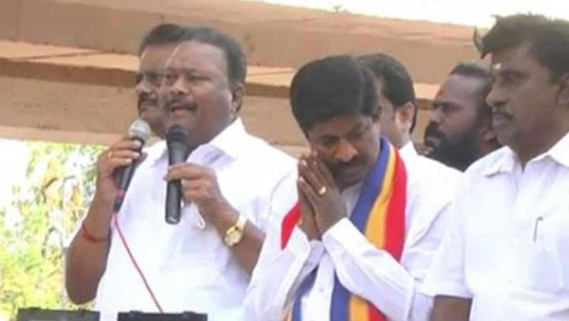 இறுதிக்கட்ட வாக்கு சேகரிப்பின் போது பாமக வேட்பாளரின் பெயரை மாற்றி கூறிய அமைச்சர் திண்டுக்கல் சீனிவாசனால் கூட்டத்தில் சலசலப்பு ஏற்பட்டது.