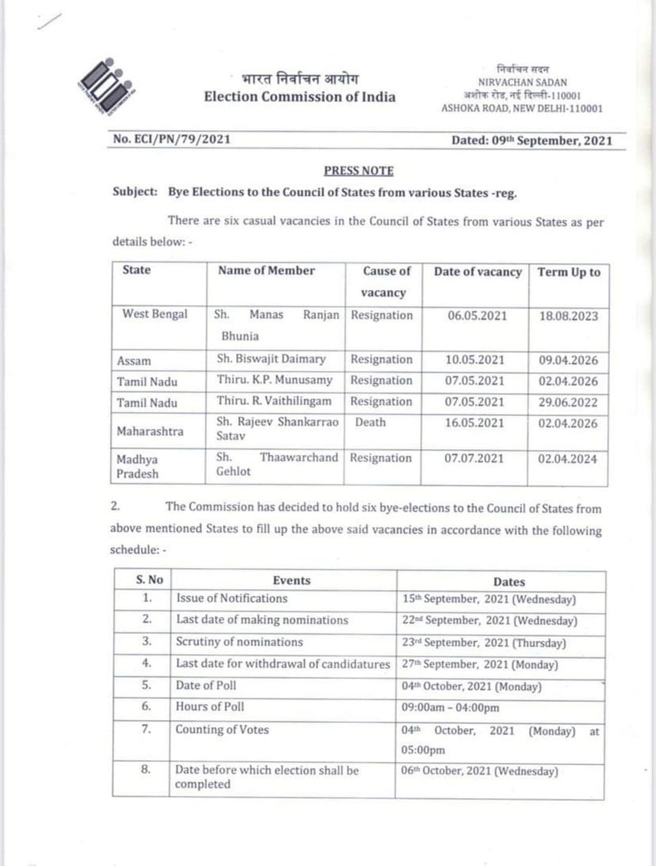 அதில், அக்டோபர் மாதம் 4ம் தேதி தேர்தல் நடைபெறும் என்று தேர்தல் ஆணையம் அறிவித்துள்ளது. அதன்படி, மாநிலங்களவை தேர்தலுக்கான வேட்புமனு தாக்கல் செப்டம்பர் 15ம் தேதி தொடங்கி செப்டம்பர் 22ம் தேதி முடியும் எனவும் தெரிவிக்கப்பட்டுள்ளது. செப்டம்பர் 23ம் வேட்புமனு பரிசீலனை, செப்டம்பர் 27ம் தேதி வேட்புமனு திரும்ப பெற கடைசி நாள் எனவும் தெரிவிக்கப்பட்டுள்ளது. அக்டோபர் 4ம் தேதி நடைபெறும் ஓட்டுப்பதிவு காலை 9 மணிக்கு தொடங்கி, மாலை 4 மணி வரை நடைபெறுகிறது. அன்றைய தினமே மாலை 5 மணிக்கு வாக்குகள் எண்ணப்பட்டு முடிவுகள் அறிவிக்கப்படும்.
