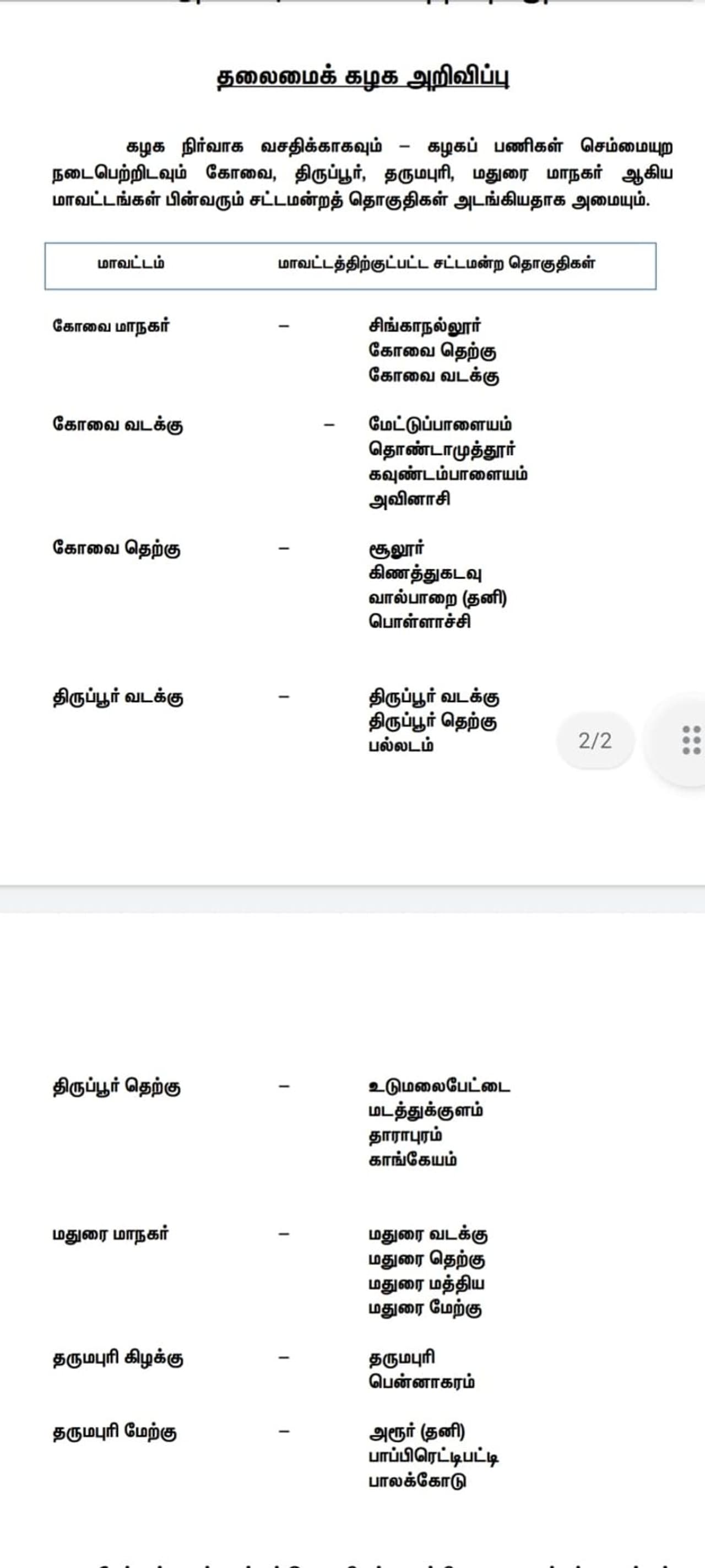 தி.மு.க. 15.ஆவது பொதுத்தேர்தல் மாவட்டக் கழகத் தேர்தல் வேட்புமனுத் தாக்கலுக்கான தேதியை அறிவித்துள்ள திமுக தலைமை, கோவை, மதுரை, திருப்பூர் உள்ளிட்ட மாவட்டங்களில் சட்டமன்ற தொகுதிகளை மாற்றி அமைத்து அறிவிப்பு வெளியிட்டுள்ளது.