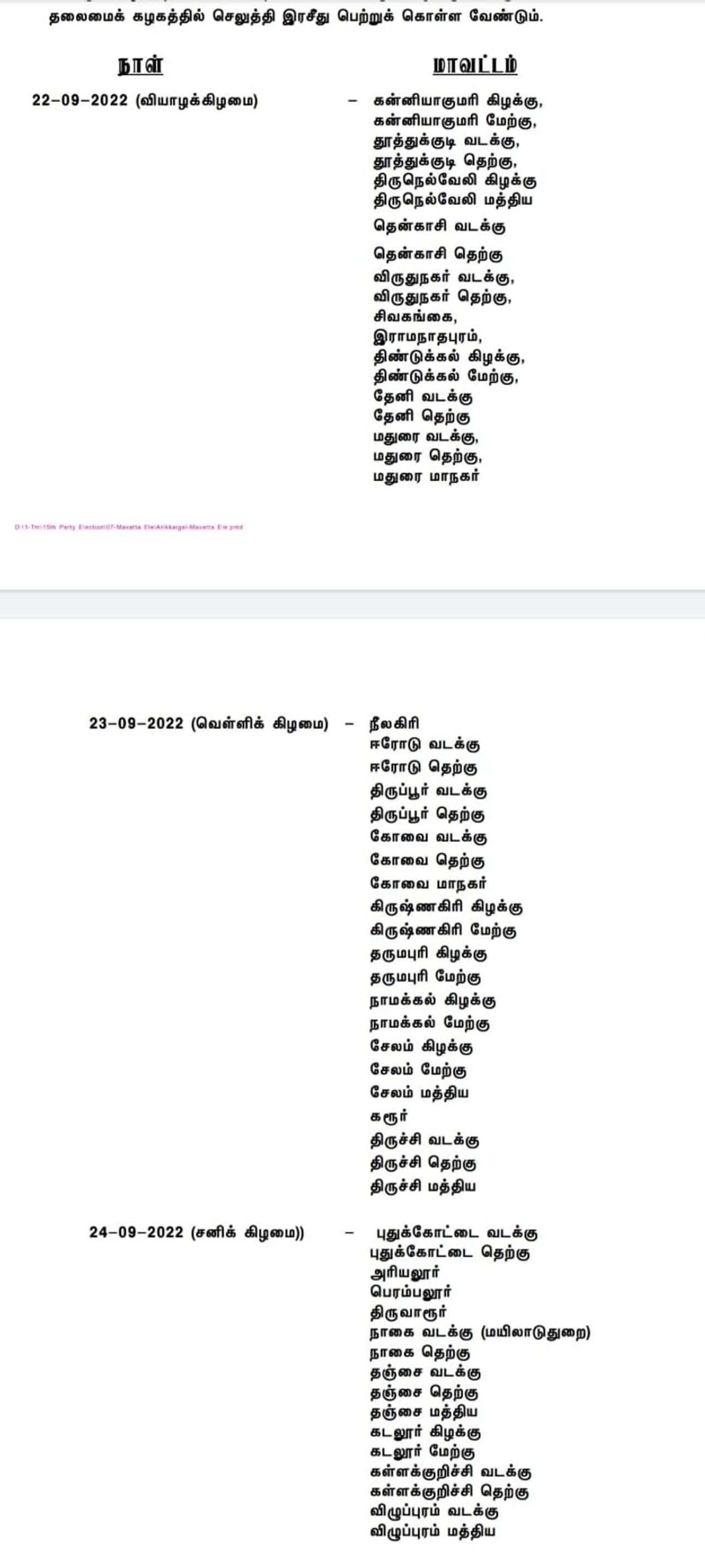 திமுக மாவட்ட செயலாளர்கள், அவைத்தலைவர்களுகான வேட்பு மனு தாக்கல் வருகிற 22 ஆம் தேதி முதல் தொடங்கப்படவுள்ளது இதற்கான அறிவிப்பை திமுக பொதுச்செயலாளர் துரைமுருகன் வெளியிட்டுள்ளார். அதில், திராவிட முன்னேற்றக் கழகத்தின் 15வது பொதுத்தேர்தல் நடைபெற இருக்கின்ற பின்வரும் புதியதாக பிரிக்கப்பட்ட மாவட்டங்களில் அவைத் தலைவர், செயலாளர், துணைச் செயலாளர்கள் மூவர் (கட்டாயமாக ஒருவர் பொதுத் தொகுதியினராகவும், ஒருவர் ஆதிதிராவிடர் அல்லது மலைவாழ் வகுப்பினராகவும், ஒருவர் மகளிராகவும் இருத்தல் வேண்டும்), பொருளாளர் மற்றும் தலைமைக் கழகத்தால் மாவட்ட வாரியாக அறிவிக்கப்பட்ட எண்ணிக்கையின் அடிப்படையில் தலைமைச் செயற்குழு உறுப்பினர்கள், பொதுக்குழு உறுப்பினர்கள் (மகளிர் ஒருவர் கட்டாயமாக இருத்தல் வேண்டும்) ஆகிய பொறுப்புக்களுக்கு போட்டியிடுவோர் அதற்கென உள்ள படிவத்தில் முறைப்படி பூர்த்தி செய்து கீழே குறிப்பிட்டுள்ள நாட்களில் பொறுப்பு ஒன்றுக்கு ரூ.25,000/- கட்டணமாக தலைமைக் கழகத்தில் செலுத்தி இரசீது பெற்றுக் கொள்ள வேண்டும் என தெரிவிக்கப்பட்டுள்ளது.