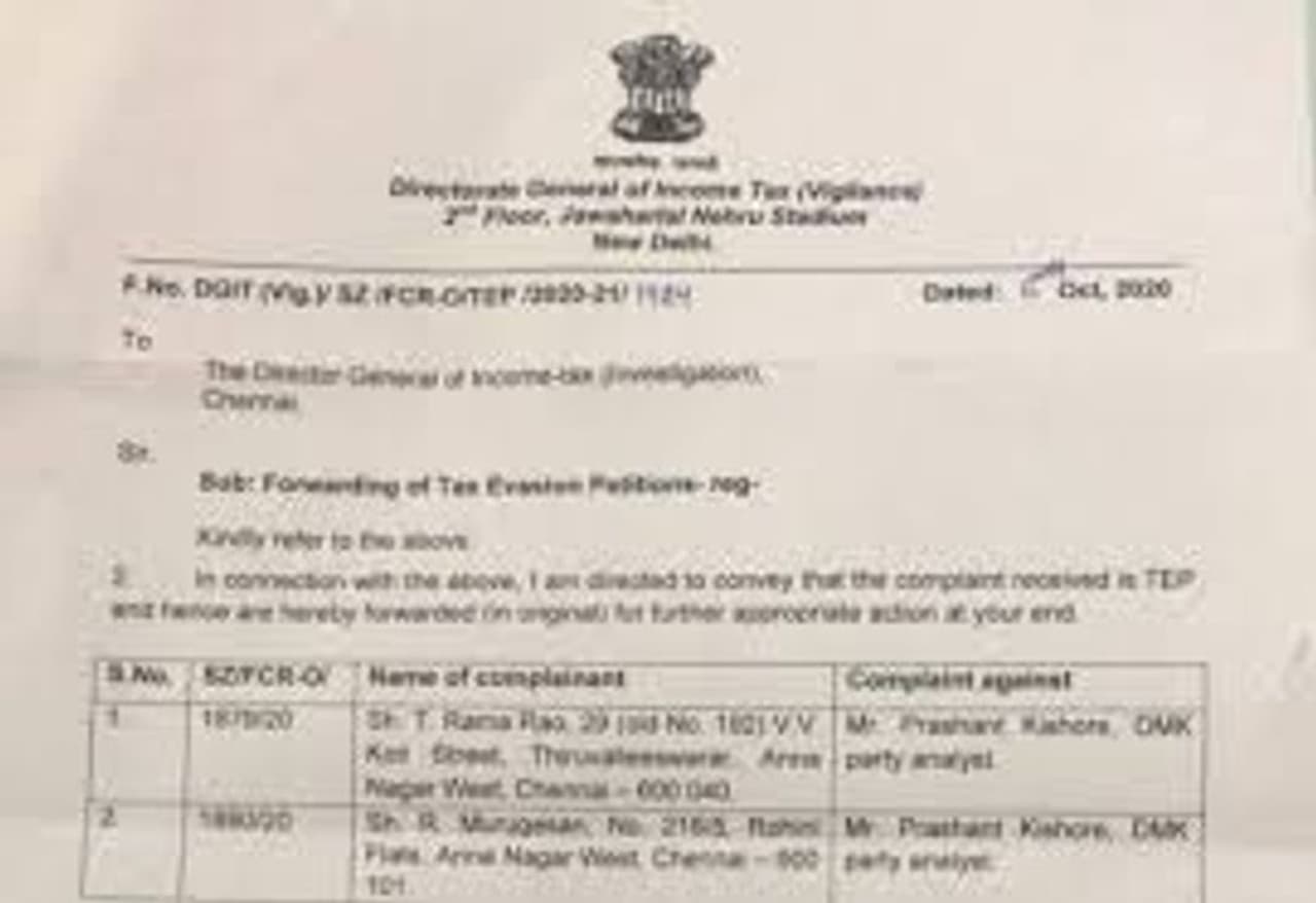 தி.மு.க.,விற்காக பணியாற்றி வரும், பிரசாந்த் கிஷோர் மீதடெல்லியில் உள்ள வருமான வரி புலனாய்வு பிரிவு இயக்குனர் ஜெனரல் அலுவலகத்தில், சென்னை, அண்ணாநகர் மேற்கு பகுதியைச் சேர்ந்த, டி.ராமாராவ் மற்றும் ஆர்.முருகேசன் ஆகியோர், வரி ஏய்ப்பு புகார் தாக்கல் செய்துள்ளனர்.அந்த மனு தொடர்பாக விசாரணை நடத்த, சென்னையில் உள்ள, வருமான வரி புலனாய்வு துறைக்கு, டில்லியில் இருந்து கடிதம் வந்துள்ளது. புகார் தொடர்பாக, வருமான வரி புலனாய்வு பிரிவு அதிகாரிகள், விசாரணை மேற்கொள்ள உள்ளனர். விசாரணை முடிவில், வரி ஏய்ப்பு செய்துள்ளாராஎன்பது குறித்து தெரியவரும்.என்கிறார்கள் வருமானவரித்துறை அதிகாரிகள்.