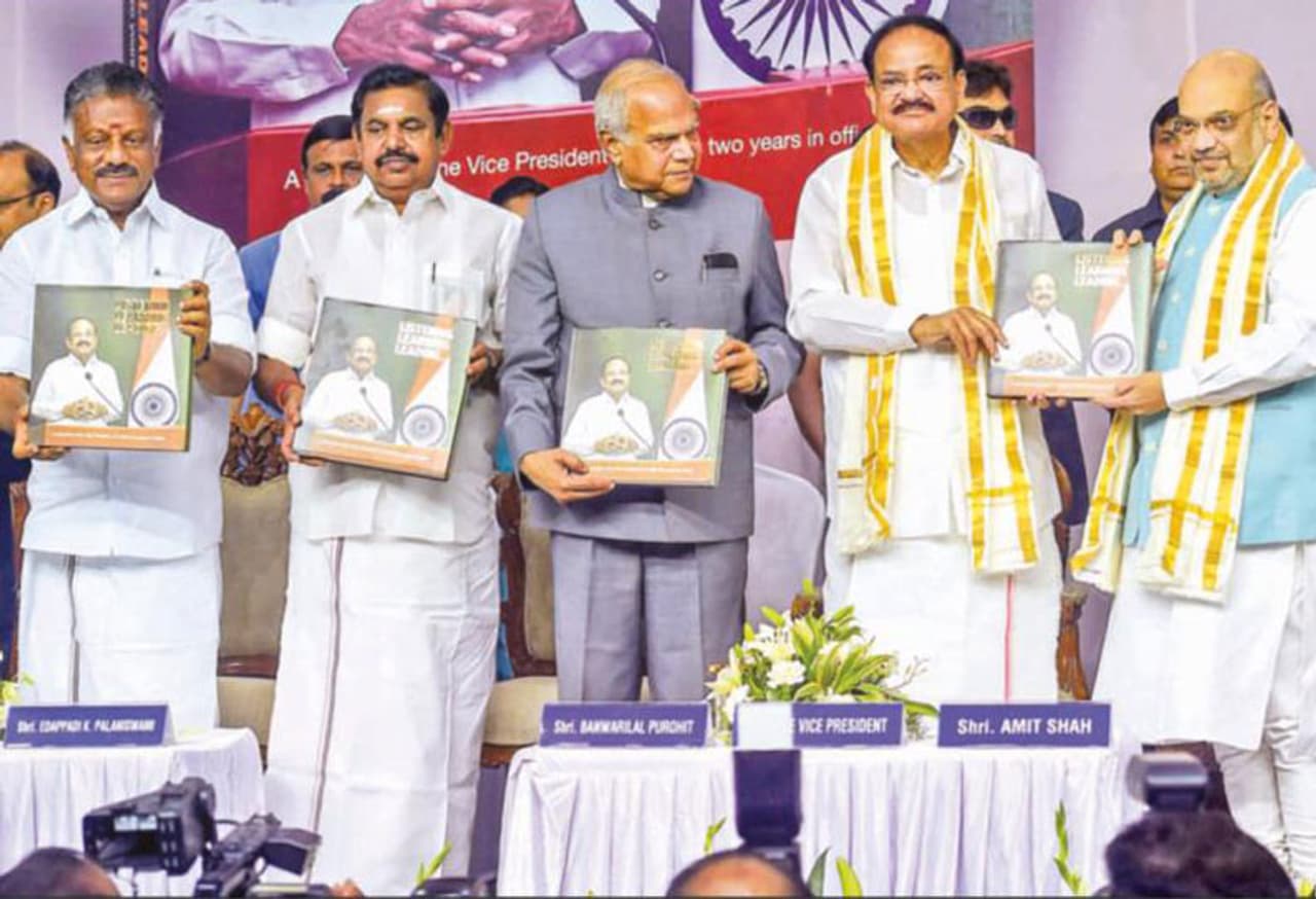 குடியரசுத் துணைத் தலைவர் வெங்கையா நாயுடு எழுதிய 'கற்றல், கற்பித்தல், தலைமையேற்றல்' என்ற புத்தகத்தின் வெளியீட்டு விழா சென்னையில் நடைபெற்றது.. இதில் பங்கேற்பதற்காக பாஜக தேசிய தலைவரும் மத்திய உள்துறை அமைச்சருமான அமித்ஷா சென்னை வந்து கவர்னர் மாளிகையில் தங்கினார்.