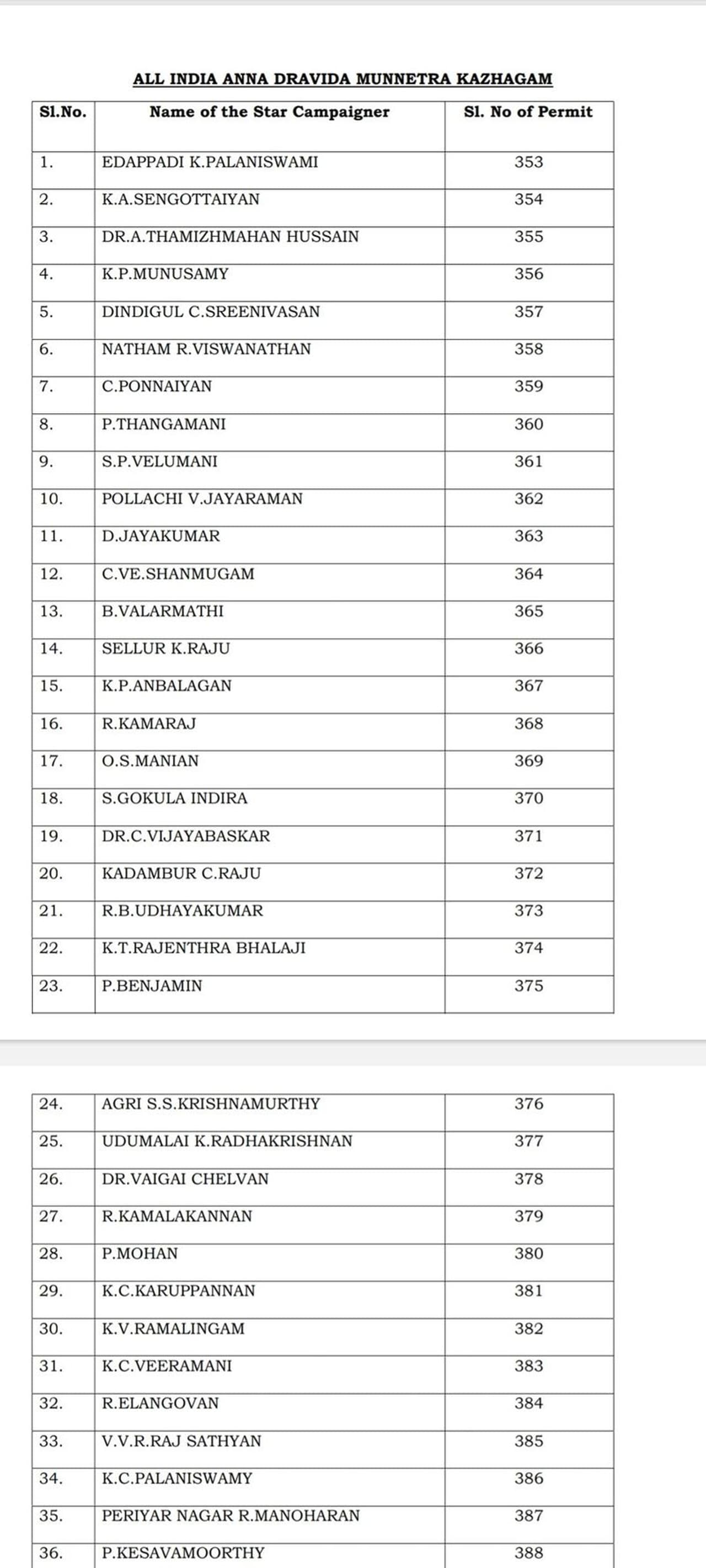 இந்நிலையில், அதிமுகவில் நட்சத்திர பேச்சாளர்கள் பட்டியலை ஓபிஎஸ், இபிஎஸ் என இருதரப்பிலும் தமிழ்நாடு தலைமை தேர்தல் அலுவலரிடம் நட்சத்திர பேச்சாளர் பட்டியல் அளிக்கப்பட்டிருந்தது. ஆனால், ஓபிஎஸ் தரப்புக்கு மறுப்பு தெரிவித்து, இபிஎஸ் தரப்புக்கு மட்டும் தேர்தல் ஆணையம் அனுமதி வழங்கியுள்ளது. தேர்தல் ஆணையம் வெளியிட்ட பட்டியலில் எடப்பாடி பழனிசாமி, செங்கோட்டையன், தமிழ் மகன் உசேன், முனுசாமி உள்ளிட்ட 40 பேர் பட்டியல் இடம்பெற்றுள்ளனர்.