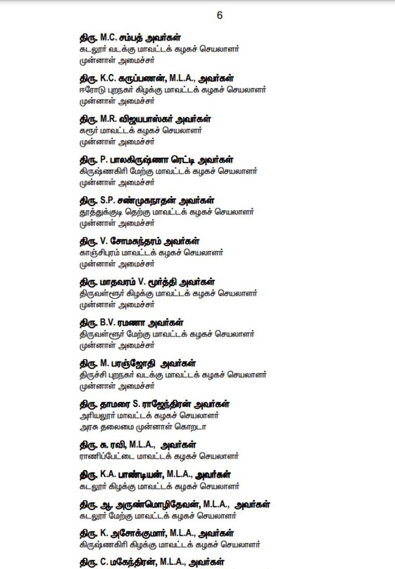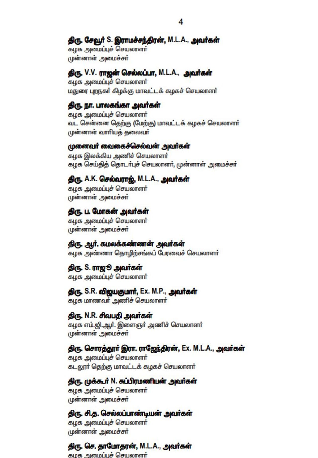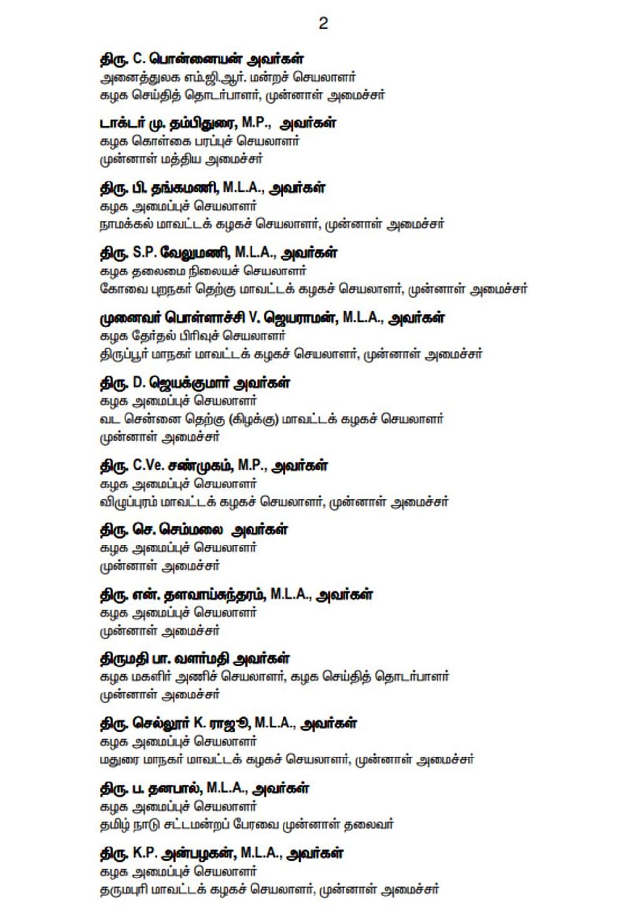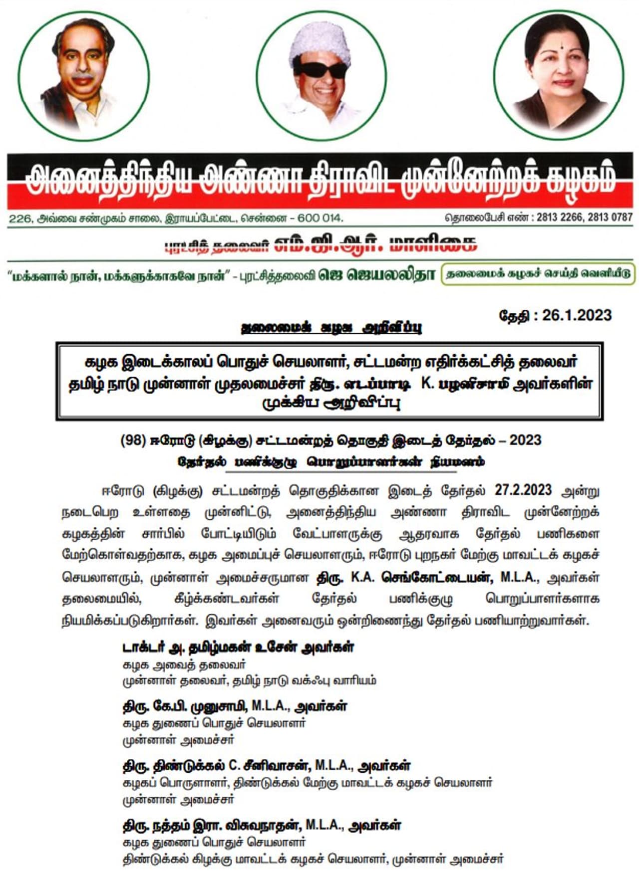 ஈரோடு கிழக்கு சட்டமன்றத் தொகுதிக்கான இடைத்தேர்தல் பிப்ரவரி 27ம் தேதியன்று நடைபெற உள்ளதை முன்னிட்டு, அனைத்திந்திய அண்ணா திராவிட முன்னேற்றக் கழகத்தின் சார்பில் போட்டியிடும் வேட்பாளருக்கு ஆதரவாக தேர்தல் பணிகளை மேற்கொள்வதற்காக, கழக அமைப்புச் செயலாளரும், ஈரோடு புறநகர் மேற்கு மாவட்டக் கழகச் செயலாளரும், முன்னாள் அமைச்சருமான K.A. செங்கோட்டையன், M.L.A., தலைமையில், கீழ்க்கண்டவர்கள் தேர்தல் பணிக்குழு பொறுப்பாளர்களாக நியமிக்கப்படுகிறார்கள். இவர்கள் அனைவரும் ஒன்றிணைந்து தேர்தல் பணியாற்றுவார்கள்.