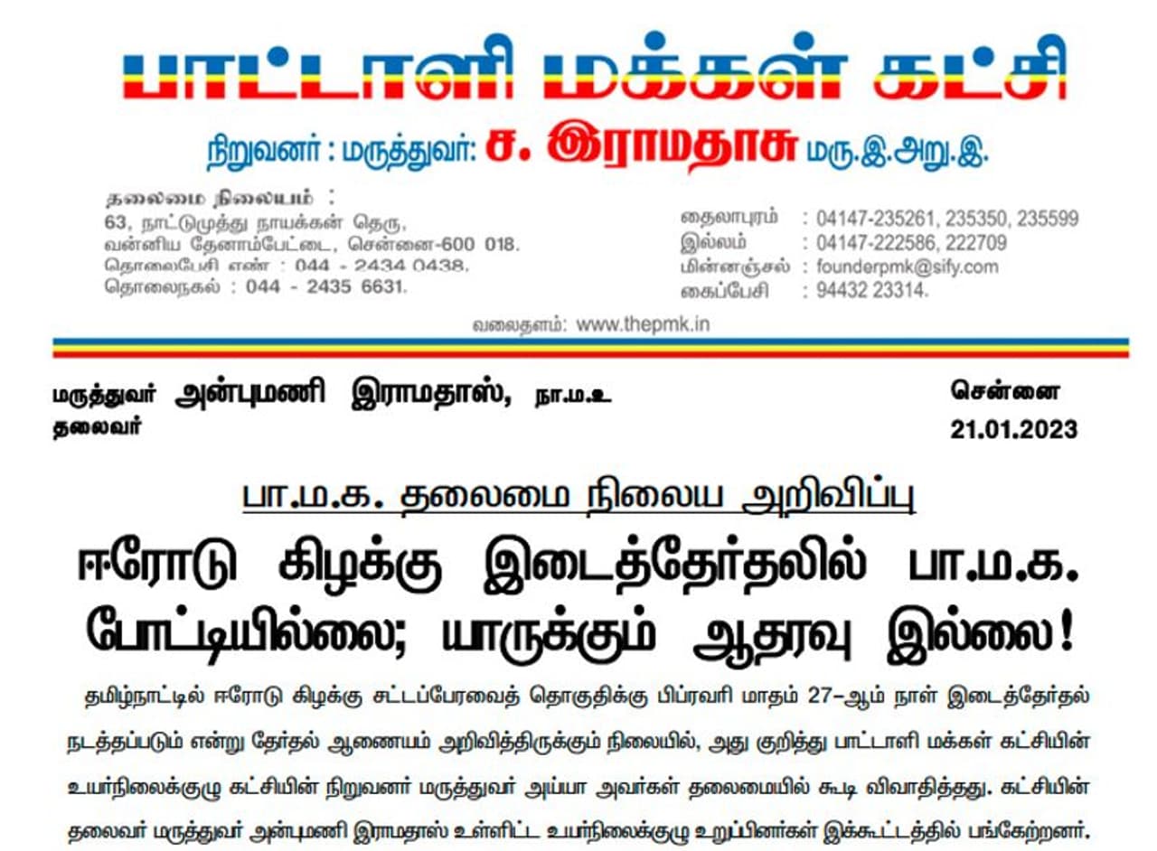 தமிழ்நாட்டில் ஈரோடு கிழக்கு சட்டப்பேரவைத் தொகுதிக்கு பிப்ரவரி மாதம் 27-ஆம் நாள் இடைத்தேர்தல் நடத்தப்படும் என்று தேர்தல் ஆணையம் அறிவித்திருக்கும் நிலையில், அது குறித்து பாட்டாளி மக்கள் கட்சியின் உயர்நிலைக்குழு கட்சியின் நிறுவனர் மருத்துவர் அய்யா அவர்கள் தலைமையில் கூடி விவாதித்தது.