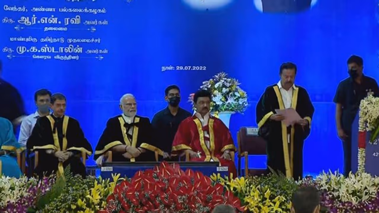பிரதமர் மோடி சிறப்பு விருந்தினராக கலந்து கொண்டுள்ள அண்ணா பல்கலைக்கழக 42வது பட்டமளிப்பு விழாவில் முதல்வர் ஸ்டாலின் பேசுகையில்;- செஸ் ஓலிம்பியாட் நேற்று தொடக்கி வைத்த பிரதமருக்கு முதலமைச்சர் ஸ்டாலின் மீண்டும் ஒரு முறை நன்றி. பட்டங்கள் என்பவை வேலைவாய்ப்புக்காக மட்டுமல்ல. அறிவினை பெருக்குவதற்கும் தான். பட்டமளிப்பு விழாவில் பிரதமர் பங்கேற்றுள்ளது இன்று பட்டம் பெறும் மாணவர்களுக்கு கிடைத்த பெருமை.