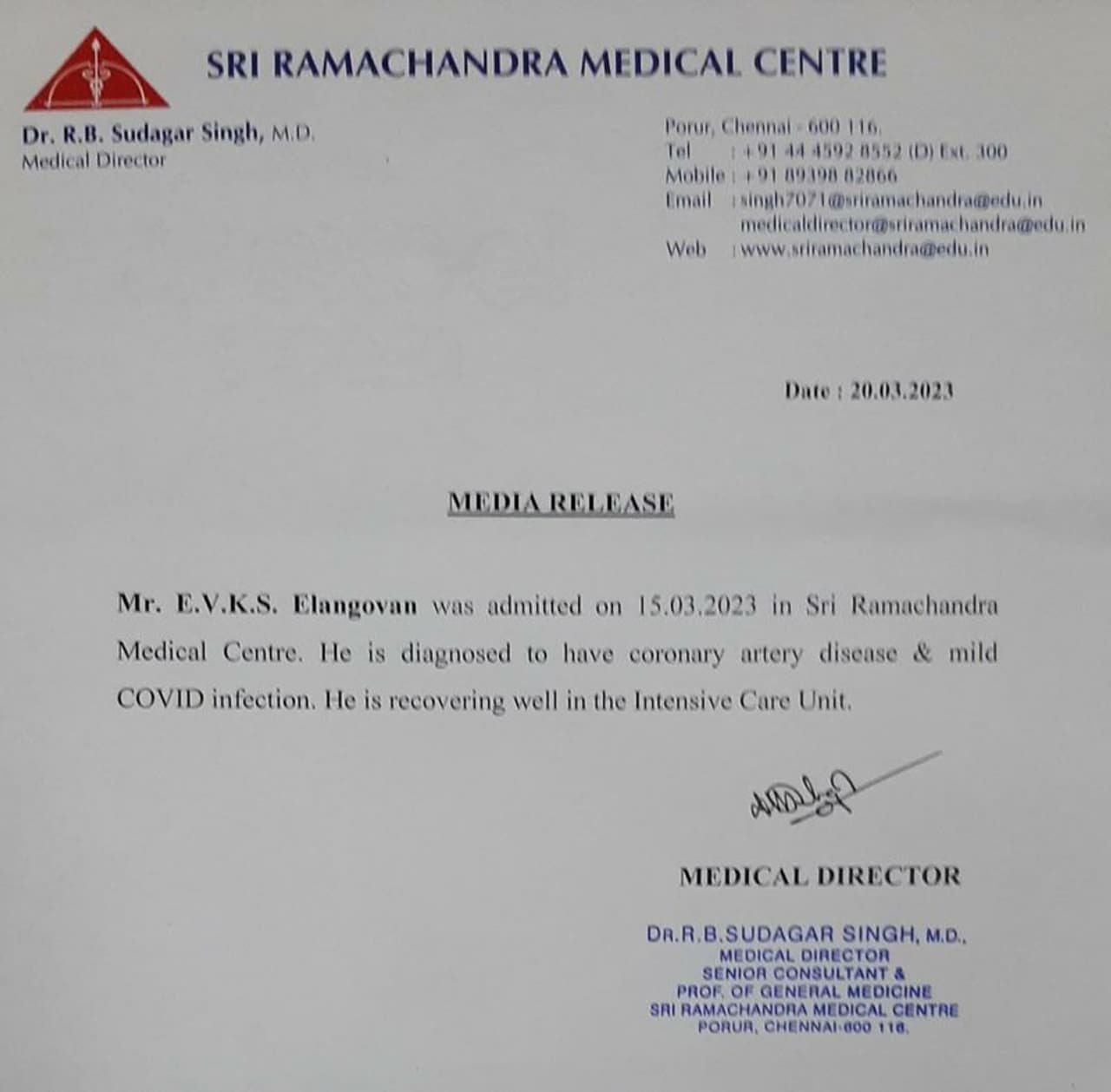 ஓரிரு நாட்களில் டிஸ்சார்ஜ் செய்யப்பட உள்ள நிலையில் இன்று அவருக்கு மேற்கொள்ளப்பட்ட பரிசோதனையில் அவருக்கு கொரோனா தொற்று இருந்தது கண்டறியப்பட்டது. இதுக்குறித்து மருத்துவமனை நிர்வாகம் வெளியிட்டுள்ள அறிக்கையில், ஈவிகேஎஸ் இளங்கோவனுக்கு லேசான கொரோனா தொற்று பரவியுள்ளது. இதனையடுத்து அவரை தீவிர சிகிச்சை பிரிவில் அனுமதித்து சிகிச்சை அளிக்கப்பட்டு வருகிறது என்று தெரிவிக்கப்பட்டுள்ளது.