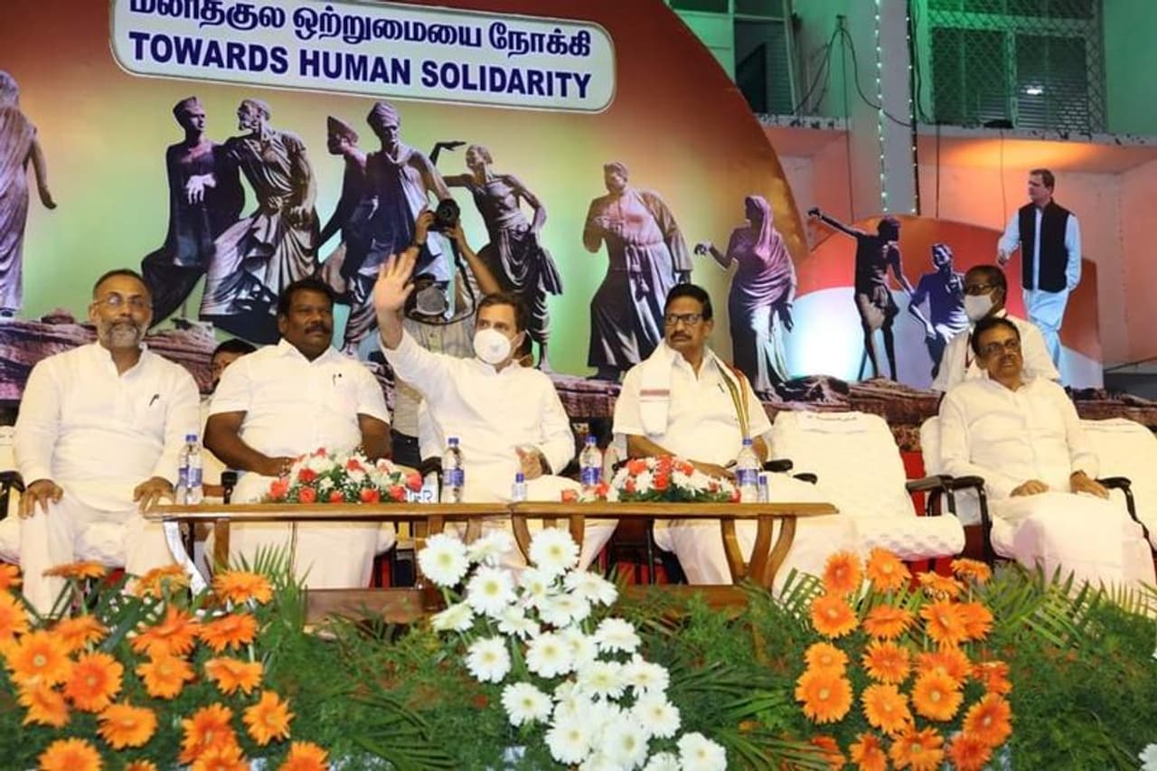 காங்கிரஸ் மூத்த தலைவர் ஈவிகேஎஸ் இளங்கோவனுக்கு ராகுல் காந்தி கலந்து கொண்ட கூட்டத்தில் இரண்டாம் வரிசையில் இருக்கை ஒதுக்கப்பட்டதால் பரபரப்பு ஏற்பட்டது.