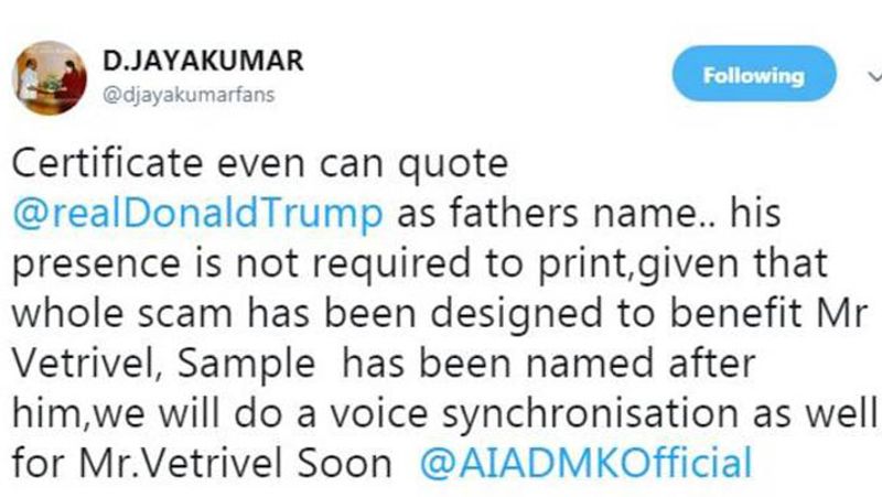 அப்பா ஸ்தானத்தில் அமெரிக்க அதிபர் ட்ரம்ப் பெயரைப் போட்டுக்கூட பெர்த் சர்டிபிகேட் வாங்கமுடியும் என்கிறபோது நாங்கள் நினைத்தால் அப்பா வெற்றிவேல் என்று சர்டிபிகேட் வாங்கமுடியாதா?’ என்று அமைச்சர் ஜெயக்குமாருக்கு வக்காலத்து வாங்க ஆரம்பித்திருக்கிறார்கள் சில அநாமதேயர்கள்.