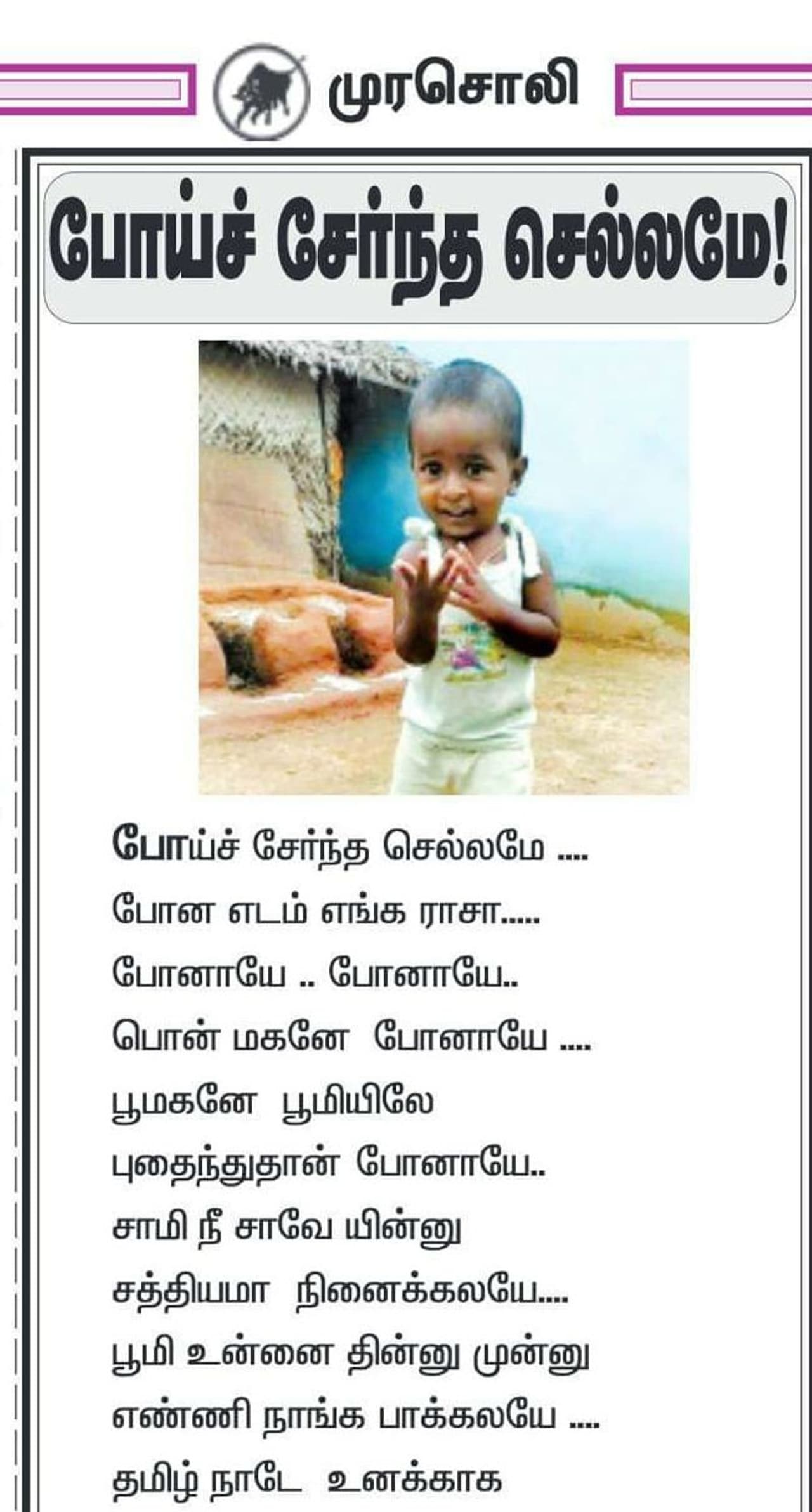 இந்நிலையில் திமுகவின் அதிகாரப்பூர்வ நாளேடான முரசொலியில் நேற்று சுர்ஜித்துக்கு போய்ச்சேர்ந்த செல்லமே என்கிற தலைப்பில் இரங்கல் கவிதை வெளியிட்டு இருந்தது. தவறாக பகிரப்பட்ட வேறு குழந்தையின் புகைப்படத்தை வைத்து சுர்ஜித்துக்கு இரங்கல் கவிதை வெளியிட்டுள்ளனர். தமிழகத்தின் மிகப்பெரிய கட்சியான திமுகவி நாளேடான முரசொலியே இந்த தவறை செய்யலாமா? என்று பலரும் கேள்வி எழுப்பி வருகின்றனர்.