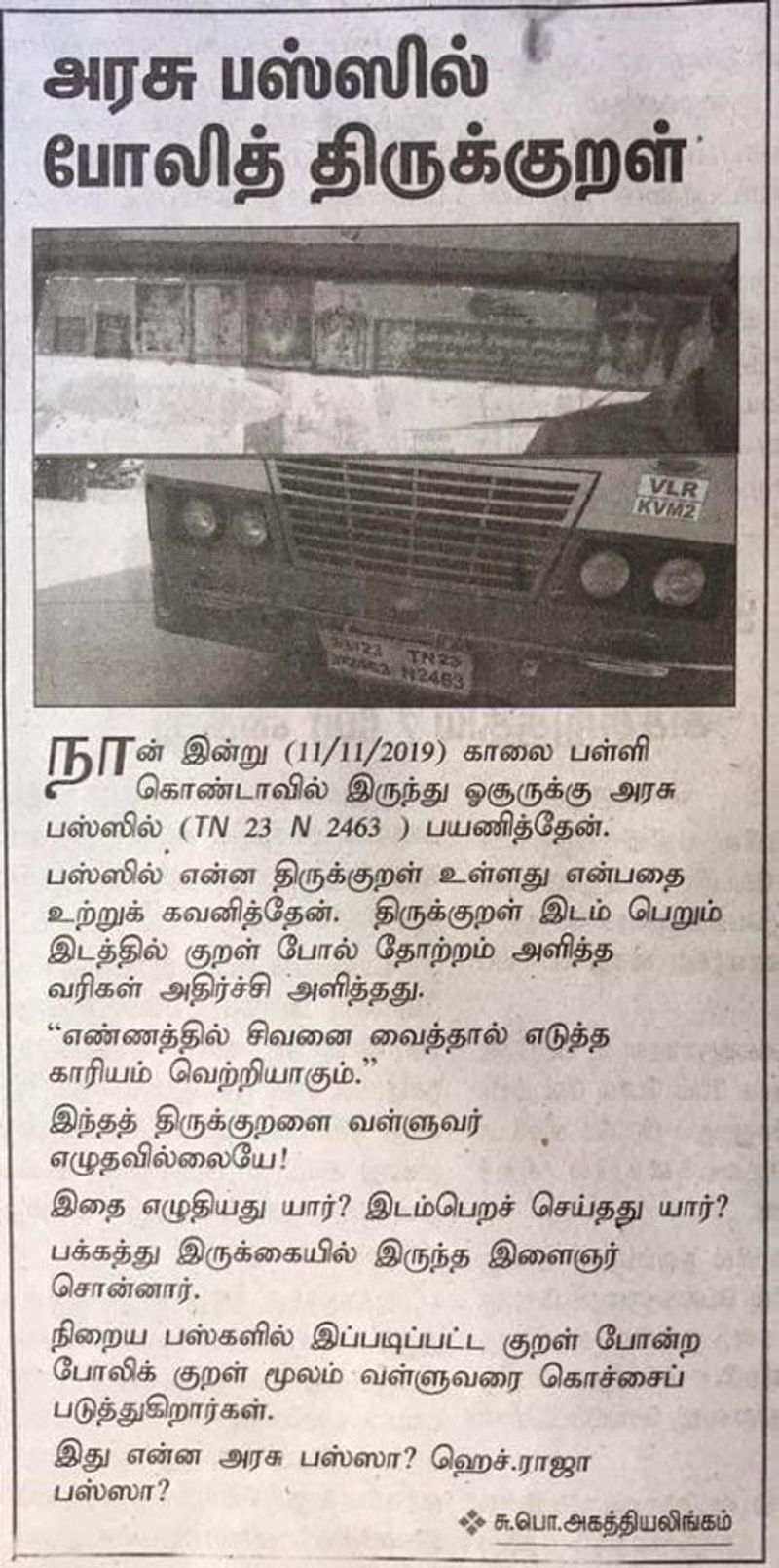 ‘’எண்ணத்தில் சிவனை வைத்தால் எடுத்த காரியம் வெற்றியாகும்’இந்தத் திருக்குறளை வள்ளுவர் எழுதவில்லையே..! இதை எழுதியது யார்? இடம்பெறச் செய்தது யார்? பக்கத்தில் இருக்கையில் இருந்த இளைஞர் சொன்னார். ‘’நிறைய பஸ்களில் இப்படிப்பட்ட குறள் போன்ற போலிக்குறள் மூல வள்ளுவரை கொச்சைப்படுத்துகிறார்கள். இதென்ன அரசு பஸ்ஸா? ஹெச்.ராஜா பஸ்ஸா? எனக் கேள்வி எழுப்பியுள்ளார். ஏற்கெனவே திருவள்ளுவருக்கு பாஜக காவி சாயம் பூசப்பட்ட விவகாரம் இன்னும் ஓய்ந்த பாடில்லை.