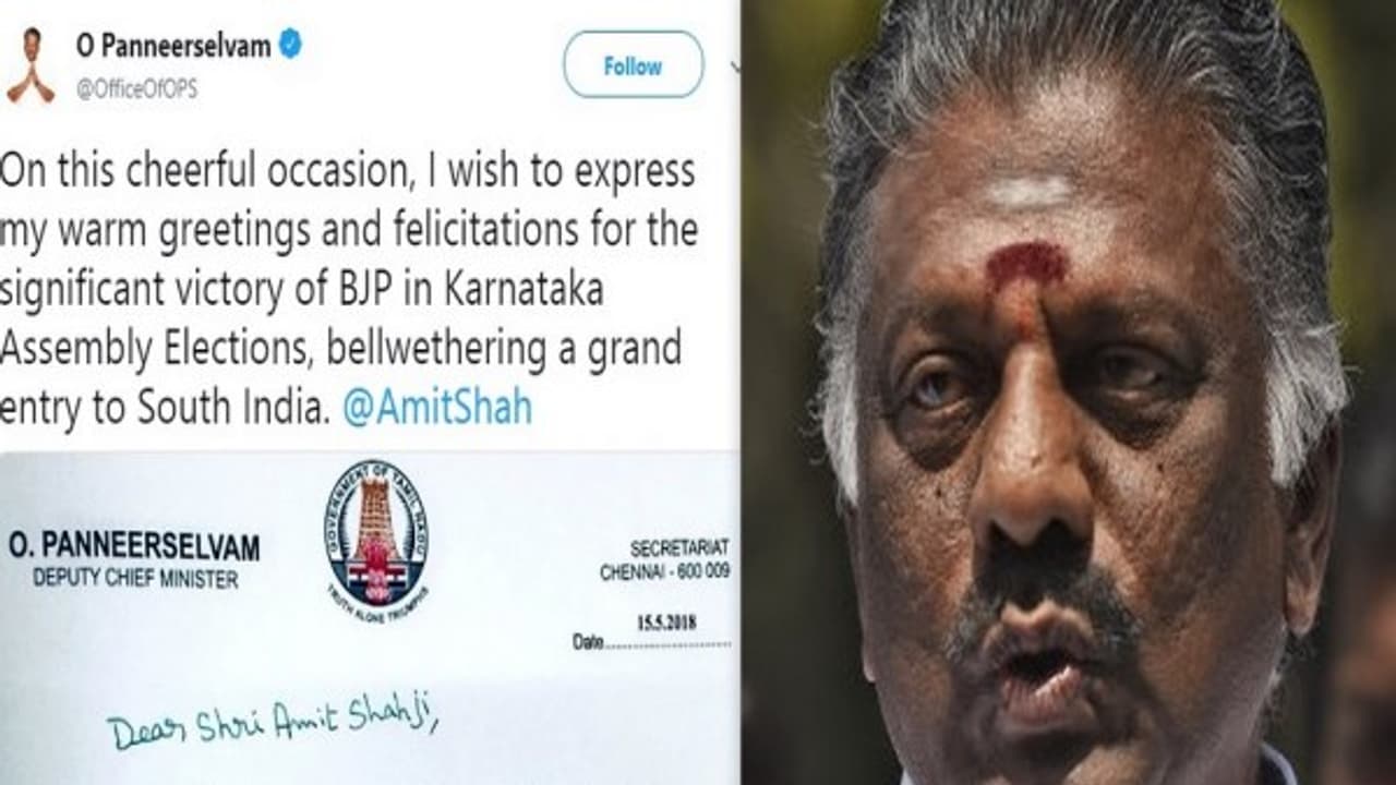 இதனை அடுத்து அமித்ஷாவுக்கு அனுப்பிய வாழ்த்துச் செய்தியினை ஓ. பன்னீர் செல்வம் தனது ட்விட்டரில் பக்கத்தில் வெளியிட்டுள்ளார். அதில், கர்நாடகத் தேர்தலில் வெற்றி பெற்றதற்கும், பிரம்மாண்டமான முறையில் தென்னிந்தியாவில் நுழையும் பாஜகவிற்கும், அக்கட்சியின் தலைவர் அமித் ஷாவுக்கும் வாழ்த்துகள் இப்படிக்கு தங்கள் உண்மையுள்ள O.பன்னீர்செல்வம் என்று குறிப்பிட்டுள்ளார்.