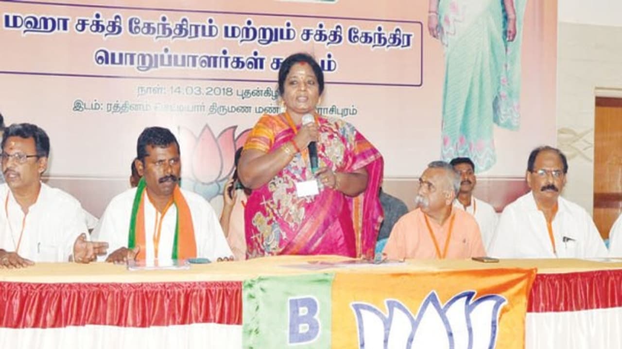 நாமக்கல் மாவட்டம், இராசிபுரத்தில் பா.ஜ.க-வின் மகா சக்திகேந்திர, சக்திகேந்திர பொறுப்பாளர்கள் கூட்டம் நேற்று நடைப்பெற்றது. இந்த நிகழ்ச்சியில் பங்கேற்பதற்காக தமிழக பா.ஜனதா மாநில தலைவர் மருத்துவர் தமிழிசை சௌந்தரராஜன் இராசிபுரத்திற்கு வந்தார்.