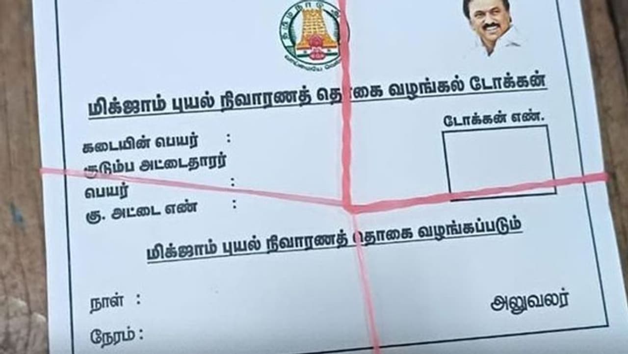 இந்நிலையில் மிக்ஜாம் புயல் நிவாரணத் தொகை வழங்குவது தொடர்பான டோக்கன் நியாய விலை கடைகளில் இன்று பிற்பகல் முதல் விநியோகம் செய்யப்பட உள்ள நிலையில் டோக்கன்களின் புகைப்படங்கள் வெளியாகியுள்ளன.