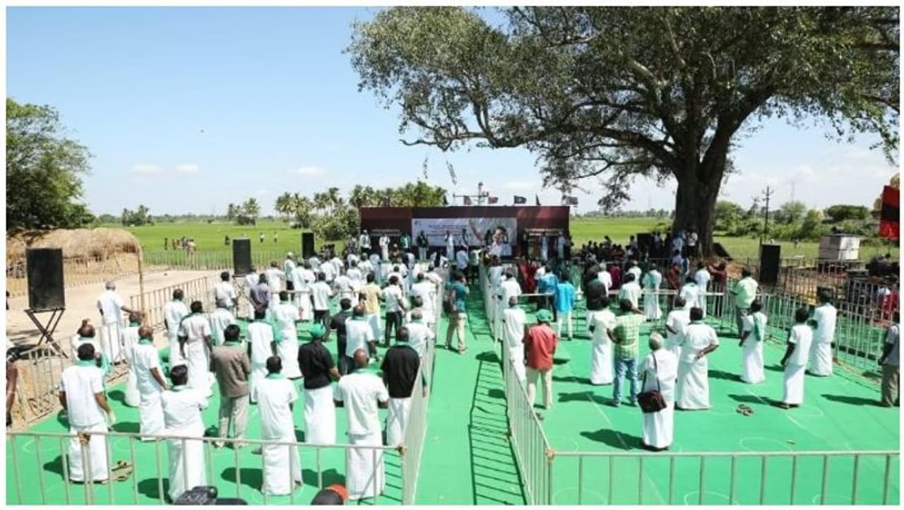 வேளாண் மசோதாக்களை திரும்ப பெற வேண்டும் என்று கோரி, காஞ்சிபுரத்தில் பச்சைத் துண்டு, பச்சை நிற மாஸ்க் அணிந்தபடி திமுக சார்பில் நடைபெற்ற ஆர்ப்பாட்டத்தில் முதன்முறையாக தி.மு.க தலைவர் ஸ்டாலின், கான்கிரீட் போடப்படாத விவசாய நிலத்தில் செருப்பு இல்லாமல் நடந்து ஆச்சர்யமூட்டியுள்ளார்.