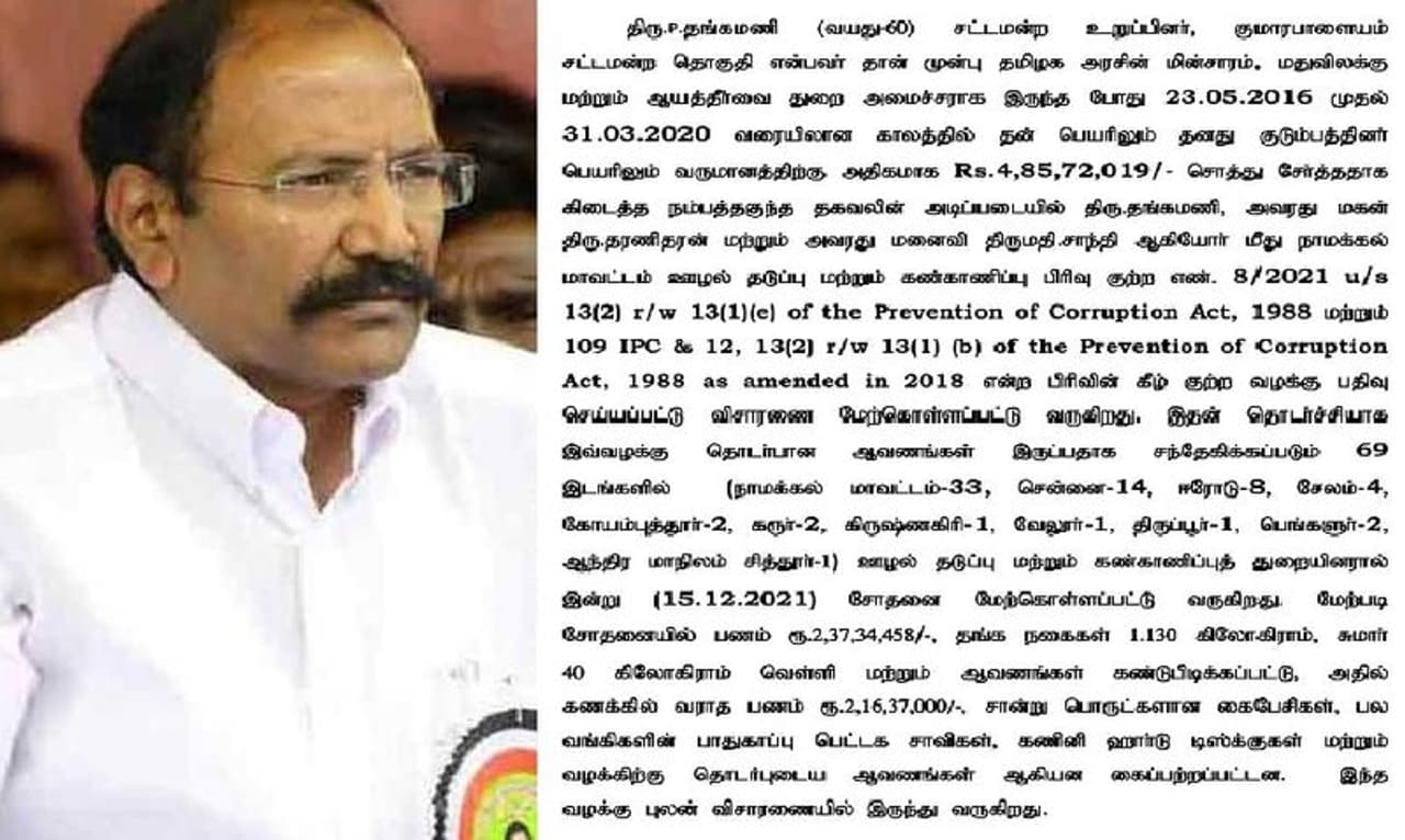 எம்.ஆர்.விஜயபாஸ்கர், வேலுமணி, கே.சி.வீரமணி, சி.விஜயபாஸ்கர் வரிசையில் ஐந்தாவது நபராக, வருமானத்துக்கு அதிகமாகச் சொத்துச் சேர்த்ததாக குற்றம்சாட்டப்பட்டு, முன்னாள் மின்சாரத்துறை அமைச்சர் தங்கமணி சம்பந்தப்பட்ட 69 இடங்களில் சோதனை நடைபெற்றது. சோதனையின் முடிவில், முன்னாள் அமைச்சர் தங்கமணிக்குச் சொந்தமான இடங்களில், கணக்கில் வராத ரூ. 2.16 கோடி பறிமுதல் செய்யப்பட்டதாக, லஞ்ச ஒழிப்புத்துறை போலீஸார் அறிக்கை மூலம் தெரிவித்தனர். இதுமட்டுமின்றி, 1.13 கிலோ தங்கம், 40 கிலோ வெள்ளி, முக்கிய ஆவணங்கள், செல்போன்கள், வங்கி பாதுகாப்புப் பெட்டக சாவிகள், கணினி ஹார்டு டிஸ்குகள் உள்ளிட்டவை கைப்பற்றப்பட்டிருப்பதாகவும் அந்த அறிக்கையில் குறிப்பிட்டிருந்தனர்.