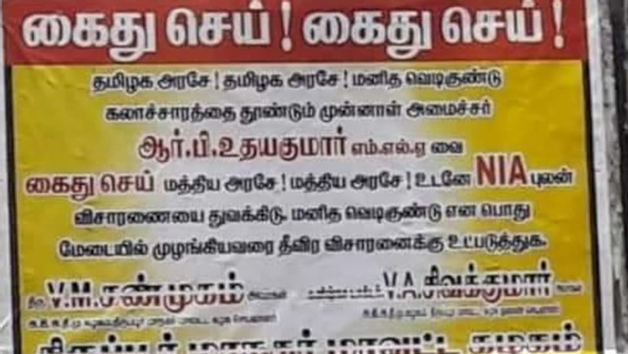இந்நிலையில், இவரது பேச்சுக்கு எதிர்ப்பு தெரிவித்து ஓபிஎஸ் அணியினர் ஓட்டியுள்ள போஸ்டர் வைரலாகி பெரும் பரபரப்பை ஏற்படுத்தியுள்ளது. அதில், கைது செய் கைது செய், தமிழக அரசே! தமிழக அரசே! மனிதவெடிகுண்டு கலாச்சாரத்தை தூண்டும் முன்னாள் அமைச்சர் ஆர்.பி.உதயகுமார் எம்.எல்.ஏ.வை கைது செய். மத்திய அரசே! மத்திய அரசே! உடனே என்ஐஏ புலன் விசாரணையை துவக்கிடு மனித வெடிகுண்டு என பொது மேடையில் முழங்கியவரை தீவிர விசாரணைக்கு உட்படுத்துக என்று தெரிவிக்கப்பட்டுள்ளது. அதில், திருப்பூர் மாநகர் மாவட்ட அதிமுக செயலாளர் வி.எம்.சண்முகம், துணை செயலாளர் கனிஷ்கா சிவக்குமார் ஆகியோரின் பெயர்கள் சுவரொட்டியில் இடம் பெற்றுள்ளது.