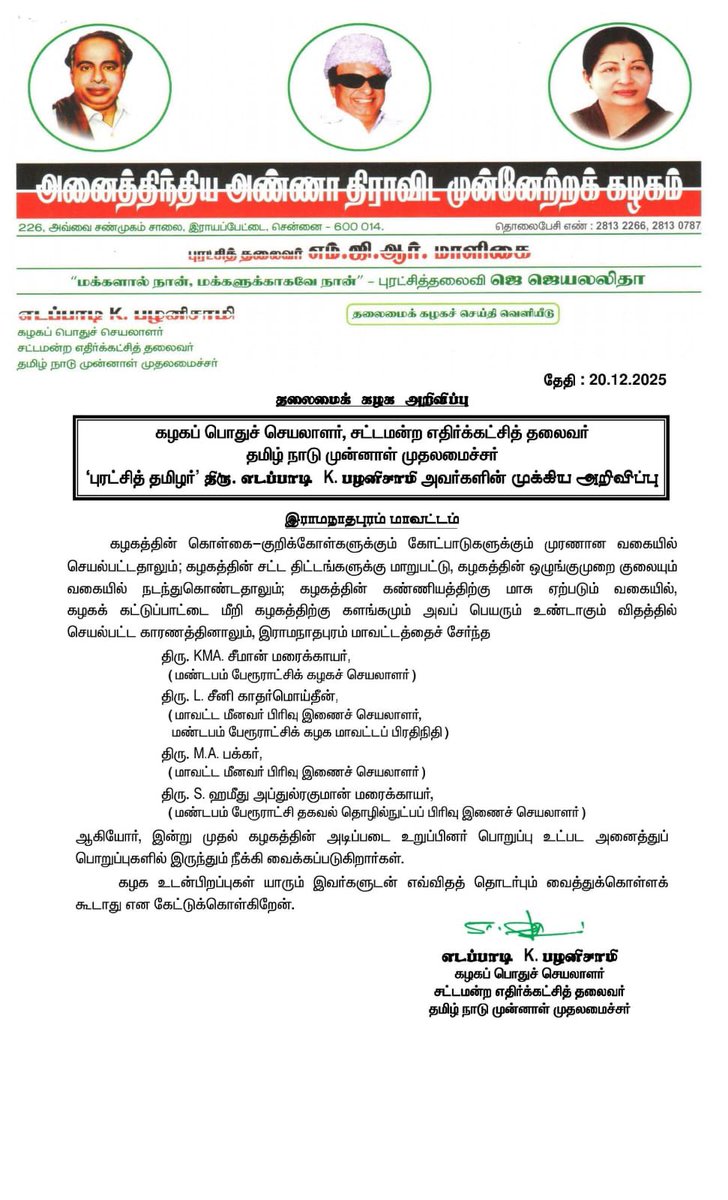இந்நிலையில், எடப்பாடி பழனிசாமி வெளியிட்டுள்ள அறிவிப்பு, ‘‘ அதிமுகவின் கொள்கை-குறிக்கோள்களுக்கும், கோட்பாடுகளுக்கும் முரணான வகையில் செயல்பட்டதாலும், அதிமுகவின் சட்ட திட்டங்களுக்கு மாறுபட்டு, ஒழுங்குமுறை குலையும் வகையில் நடந்துகொண்டதாலும், கண்ணியத்திற்கு மாசு ஏற்படும் வகையில், கட்டுப்பாட்டை மீறி களங்கமும் அவப் பெயரும் உண்டாகும் விதத்தில் செயல்பட்ட காரணத்தினாலும், இராமநாதபுரம் மாவட்டத்தைச் சேர்ந்த மண்டபம் பேரூராட்சிக் கழகச் செயலாளர் கே.எம்.ஏ.சீமான் மரைக்காயர், மாவட்ட மீனவர் பிரிவு இணைச் செயலாளரும், மண்டபம் பேரூராட்சிக் கழக மாவட்டப் பிரதிநிதியுமான எல்.சீனி காதர்மொய்தீன், மாவட்ட மீனவர் பிரிவு இணைச் செயலாளர் எம்.ஏ.பக்கர்,