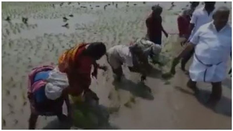 திருப்புவனம், அகரம் அருகே சென்று கொண்டிருந்தபோது அங்கே நாற்று நட்ட பெண்களை கண்டதும் அவர்களிடம் சென்று வாக்கு சேகரித்தார்.