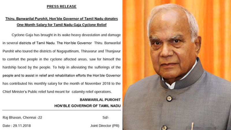 இந்நிலையில் தமிழக ஆளுநர் பன்வாரிலால் கஜா புயல் நிவாரணப் பணிக்கு தனது ஒரு மாத ஊதியத்தை முதலமைச்சரின் பொது நிவாரண நிதிக்கு வழங்கியுள்ளார்.