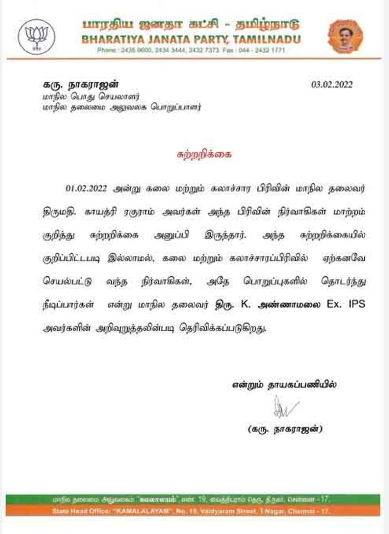 இது தொடர்பாக கரு.நாகராஜன் வெளியிட்டுள்ள அறிக்கையில்;- 01.02.2022 அன்று கலை மற்றும் கலாச்சார பிரிவின் மாநிலத் தலைவர் காயத்ரி ரகுராம், அந்த பிரிவின் நிர்வாகிகள் மாற்றம் குறித்து சுற்றறிக்கை அனுப்பி இருந்தார். அந்த சுற்றறிக்கையில் குறிப்பிட்டபடி இல்லாமல், கலை மற்றும் கலாச்சார பிரிவில் ஏற்கனவே செயல்பட்டு வந்த நிர்வாகிகள், அதே பொறுப்புகளில் தொடர்ந்து நீடிப்பார்கள் என்று மாநிலத் தலைவர் அண்ணாமலை அறிவுறுத்தலின்படி தெரிவிக்கப்படுகிறது என கரு.நாகராஜன் தெரிவித்துள்ளார்.