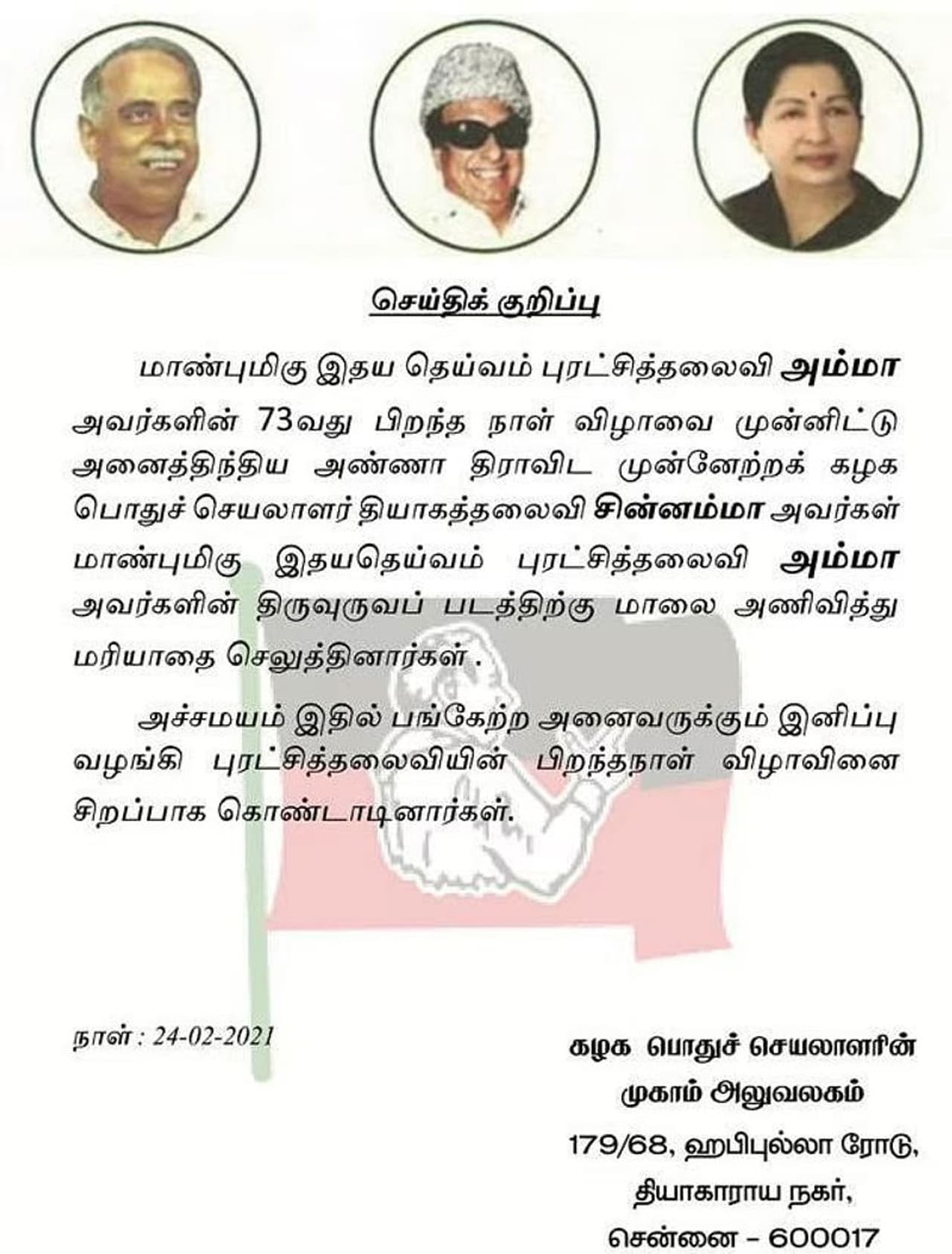 அச்சமயம் இதில் பங்கேற்ற அனைவருக்கும் இனிப்பு வழங்கி புரட்சித்தலைவியின் பிறந்தநாள் விழாவினை சிறப்பாக கொண்டாடினார்கள் என்று குறிப்பிடப்பட்டிருக்கிறது. மேலும், இந்த செய்தி அறிக்கையை வெளியிட்டது, கழக பொதுச்செயலாளரின் முகாம் அலுவலகம், 179/68, ஹபீபுல்லா ரோடு, தியாகராய நகர், என்றும் குறிப்பிடப்பட்டிருந்தது.