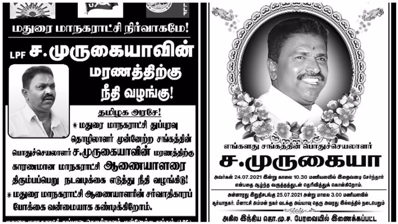 மதுரை மாநகராட்சி துப்புரவு தொழிலாளர் முன்னேற்ற சங்க நிர்வாகி ச.முருகையா, தொழிலாளர்கள் கோரிக்கை சம்பந்தமாக மாநகராட்சி உயர் அதிகாரியான கார்த்திகேயனை சந்திக்க சென்றுள்ளார். ஆனால் முருகையாவை சந்திக்க மறுத்துள்ளார் ஆணையரான கார்த்திகேயன். முருகையாவை காக்க வைத்து அலைத்ததால் மன உளைச்சலுக்கு ஆளான தொழிற்சங்க நிர்வாகி முருகையா திடீரென இறந்து விட்டார். ஏற்கனவே, மாநகராட்சி துாய்மை பணியாளர் ஒருவர் மின்சாரம் தாக்கி ஒரு கையை இழந்து விட்டார்.