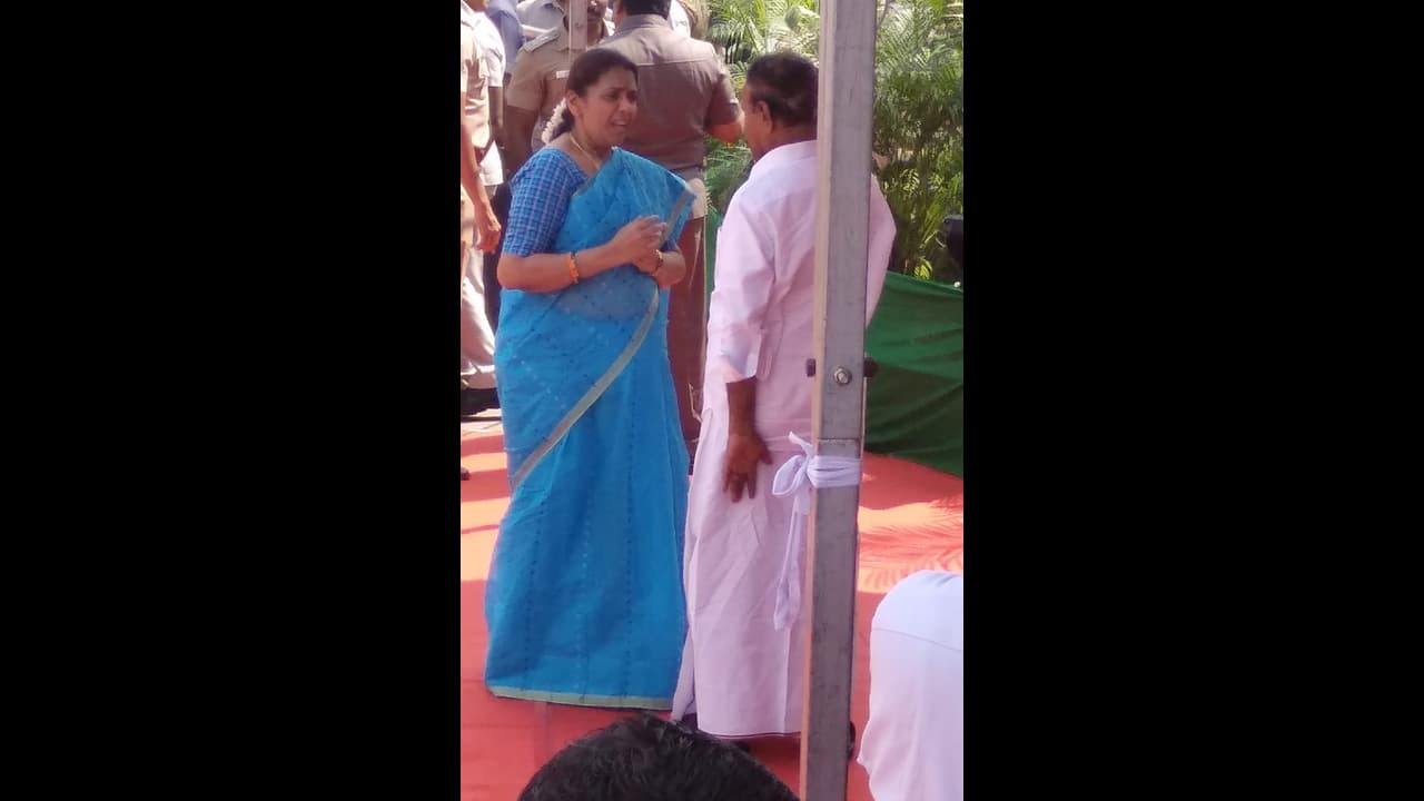 இந்நிலையில் கோகுல இந்திராவை மேடையில் ஏறவிடாத அதிகாரிகள் இது அரசு விழா, அமைச்சர்களுக்கு மட்டும் தான் இருக்கை ஒதுக்கப்பட்டிருப்பதாக கூறினர். நான் கட்சியின் அமைப்புச் செயலாளர், முக்கியமான ஆள் எனக்கே இருக்கை இல்லையா? என அவர் ஆத்திரமடைந்தார்.