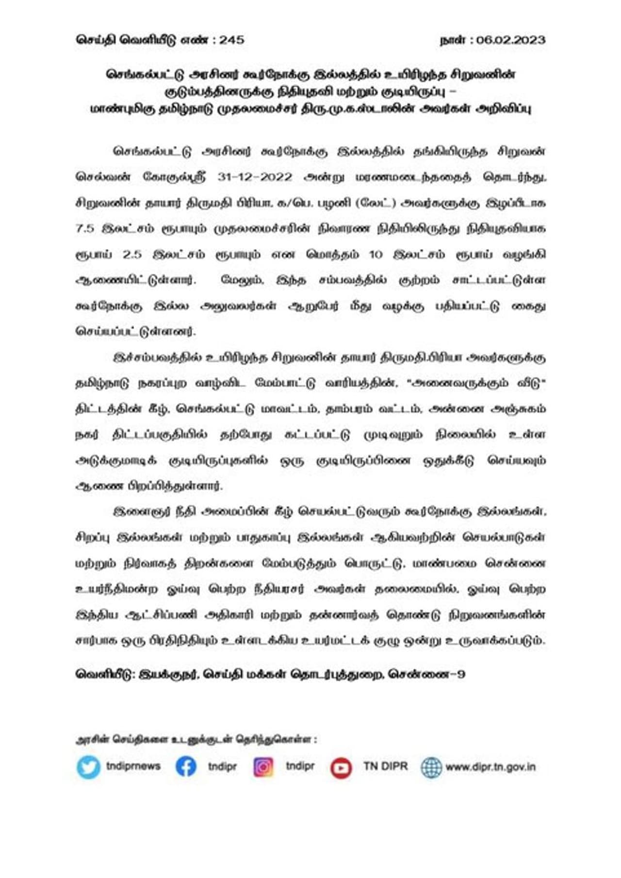 இச்சம்பவத்தில் உயிரிழந்த சிறுவனின் தாயார் பிரியா அவர்களுக்கு தமிழ்நாடு நகரப்புற வாழ்விட மேம்பாட்டு வாரியத்தின், “அனைவருக்கும் வீடு” திட்டத்தின் கீழ், செங்கல்பட்டு மாவட்டம், தாம்பரம் வட்டம், அன்னை அஞ்சுகம் நகர் திட்டப்பகுதியில் தற்போது கட்டப்பட்டு முடிவுறும் நிலையில் உள்ள அடுக்குமாடிக் குடியிருப்புகளில் ஒரு குடியிருப்பினை ஒதுக்கீடு செய்யவும் ஆணை பிறப்பித்துள்ளார்.