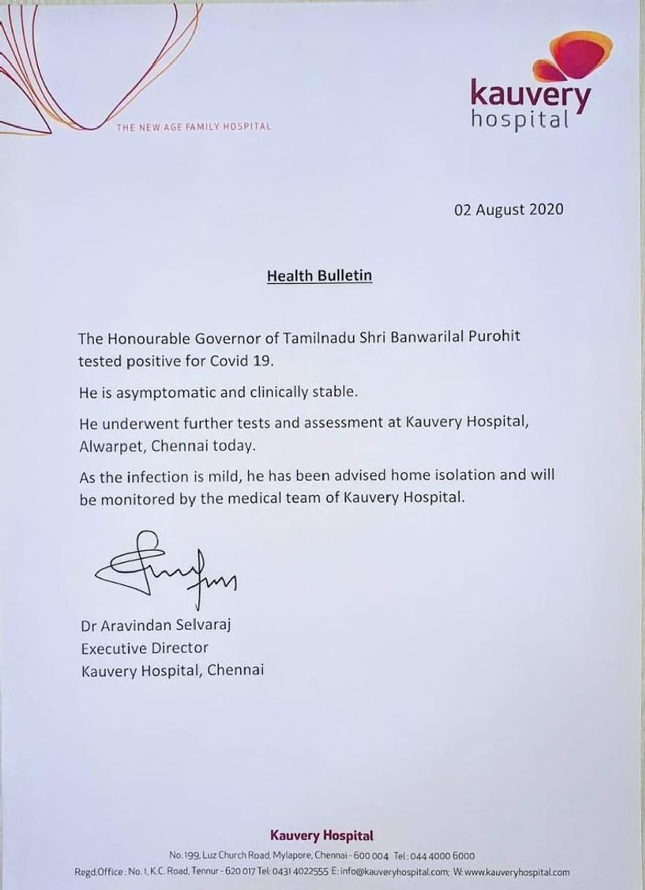 பின்னர், அவருக்கு காலையில் கொரோனா பரிசோதனை மேற்கொள்ளப்பட்டது. அதில், ஆளுநர் பன்வாரிலாலுக்கு தொற்று உறுதி செய்யப்பட்டுள்ளது. ஆனால், கொரோனா தொடர்பாக எந்த அறிகுறி ஏதும் இல்லாததால் ஆளுநரை வீட்டிலேயே தனிமைப்படுத்திக்கொள்ள மருத்துவர்கள் அறிவுறுத்தியுள்ளனர். மேலும், அவரது உடல்நிலை சீராக உள்ளதாக மருத்துவமனை நிர்வாகம் தெரிவித்துள்ளது.