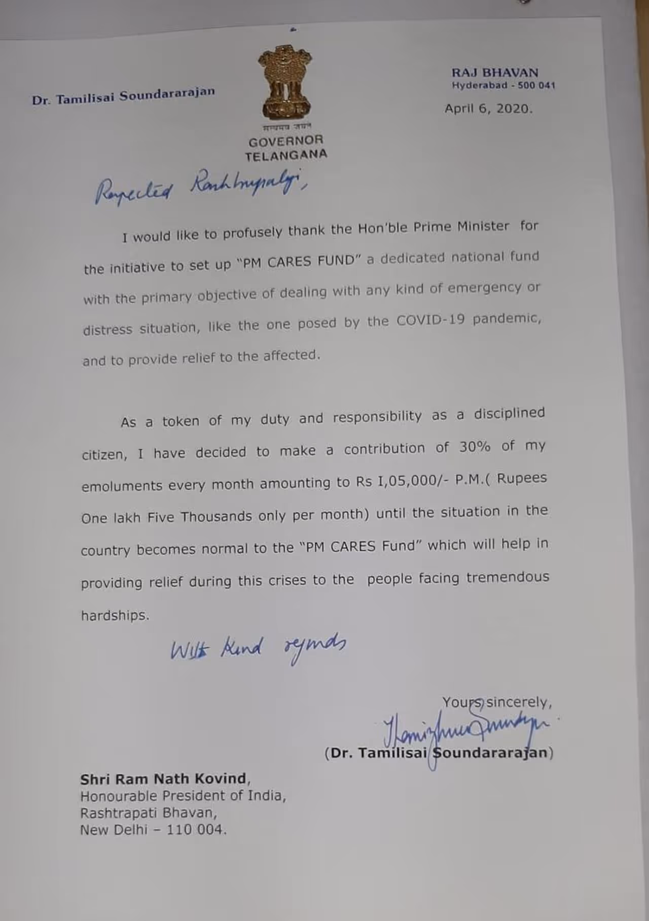 இதனிடையே கொரோனா நிவாரண நிதி அளிக்குமாறு மத்திய அரசு நாட்டு மக்களுக்கு கோரிக்கை விடுத்திருந்தது. மக்கள் தங்கள் நிவாரண நிதியை நேரடியாக PM CARE FUND என்கிற வங்கிக்கணக்கில் செலுத்தலாம் என்றும் கூறப்பட்டிருந்தது. அதன்படி பொதுமக்கள், முன்னணி நிறுவனங்கள், திரைப் பிரபலங்கள், அரசியல் கட்சிகள், விளையாட்டு வீரர்கள் என ஏராளமானோர் கொரோனா நிவாரண நிதி வழங்கி வருகின்றனர். இந்த நிலையில் தெலுங்கானா ஆளுநர் தமிழிசை சௌந்தர்ராஜன் நாட்டின் நிலைமை சீராகும் வரையில் மாதம்தோறும் கொரோனா நிதியுதவி அளிப்பதாக கூறி இருக்கிறார்.