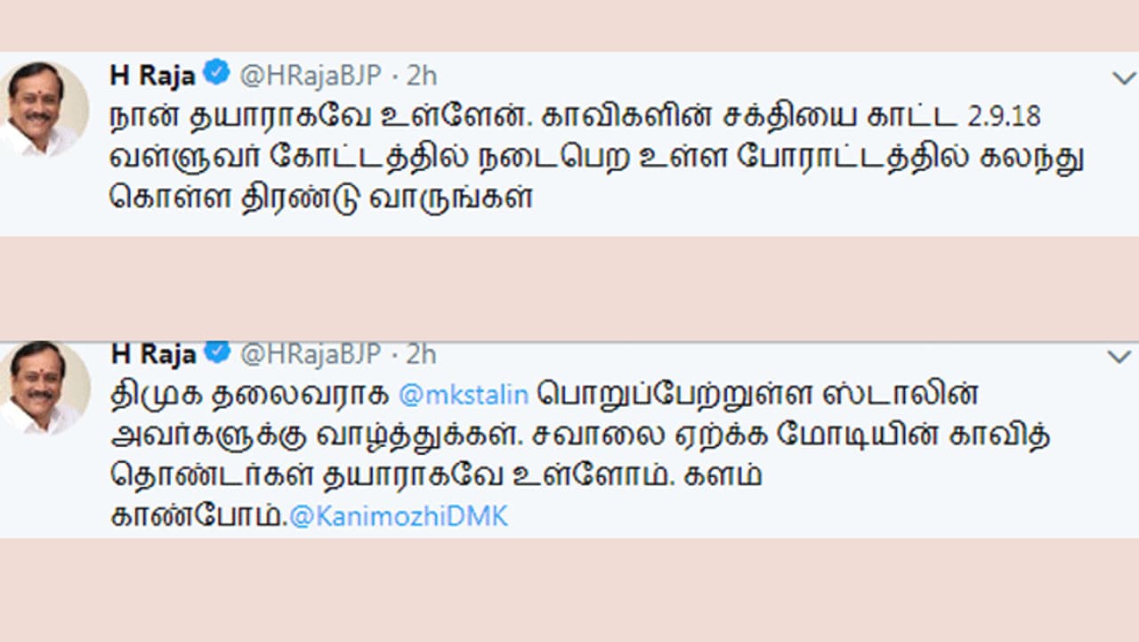 இதுதொடர்பாக எச்.ராஜா டிவிட்டர் பக்கத்தில் பதிவிட்டுள்ளார். திமுக தலைவராக பொறுப்பேற்றுள்ள ஸ்டாலின் அவர்களுக்கு வாழ்த்துகள். சவாலை ஏற்க மோடியின் காவித் தொண்டர்கள் தயாராகவே உள்ளோம். களம் காண்போம் என்றார். இதேபோல் மேலும் டிவிட்டர் பதிவில் காவிகளின் சக்தியை காட்ட 2.9.18 வள்ளுவர் கோட்டத்தில் நடைபெற உள்ள போராட்டத்தில் கலந்து கொள்ள திரண்டு வாரீர் என்று பதிவிட்டுள்ளார்.