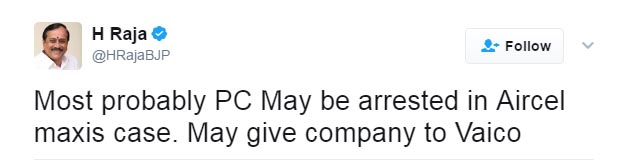 இதுகுறித்து டுவிட்டர் பக்கத்தில் எச்.ராஜா கூறியிருப்பதாவது:- 'முன்னாள் நிதியமைச்சர் ப.சிதம்பரம் ஏர்செல் - மேக்சிஸ் வழக்கில் சிறைக்கு செல்லும் வாய்ப்பு உள்ளது. அவர் சிறையில் உள்ள வைகோவுக்கு துணையாக இருப்பார்” என குறிப்பிட்டுள்ளார்.