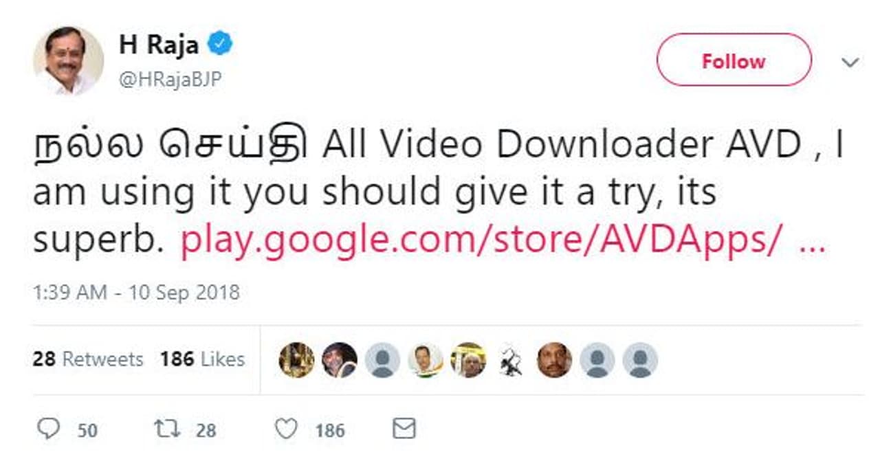 AVD எனும் இந்த அப்ளிகேஷன் ஒரு பைரசி அப்ளிகேஷன். யூ டுயூபில் இருக்கும் வீடியோக்களை இவ்வாறு பிற அப்ளிகேஷன் கொண்டு டவுன்லோட் செய்வது தவறு. அந்த தவறை செய்ய கூடிய பைரசி ஆப் தான் இந்த AVD. இதன் லிங்கை தான் தன்னுடைய டிவிட்டர் பக்கத்தில் பகிர்ந்திருக்கிறார் எச்.ராஜா. இதில் ஹைலைட் என்ன என்றால் அவரின் இந்த டிவீட்டை பார்த்த பிறகு கூகுள் அதன் தளத்தில் இருந்து AVD ஆப்-ஐ நீக்கிவிட்டது.