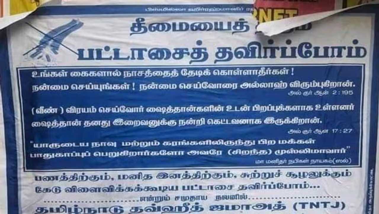 விருதுநகர் மாவட்டம் அருப்புக்கோட்டை தமிழ்நாடு ஜமாத் அமைப்பு சுவரொட்டி பெரும் சர்ச்சையை ஏற்படுத்தியுள்ளது. அதில், தீமையை தரும் பட்டாசை தவிர்போம். உங்கள் கைகளால் நாசத்தை தேடிக் கொள்ளாதீர்கள். நன்மையை செய்யுங்கள். நன்மை செய்வோரை அல்லாஹ் விரும்புகிறான். வீண் விரயம் செய்வோர் ஷைத்தான்களின் உடல் பிறப்புக்களாக உள்ளனர். ஷைத்தான் தனது இறைவனுக்கு நன்றி கெட்டவனாக இருக்கிறான்.