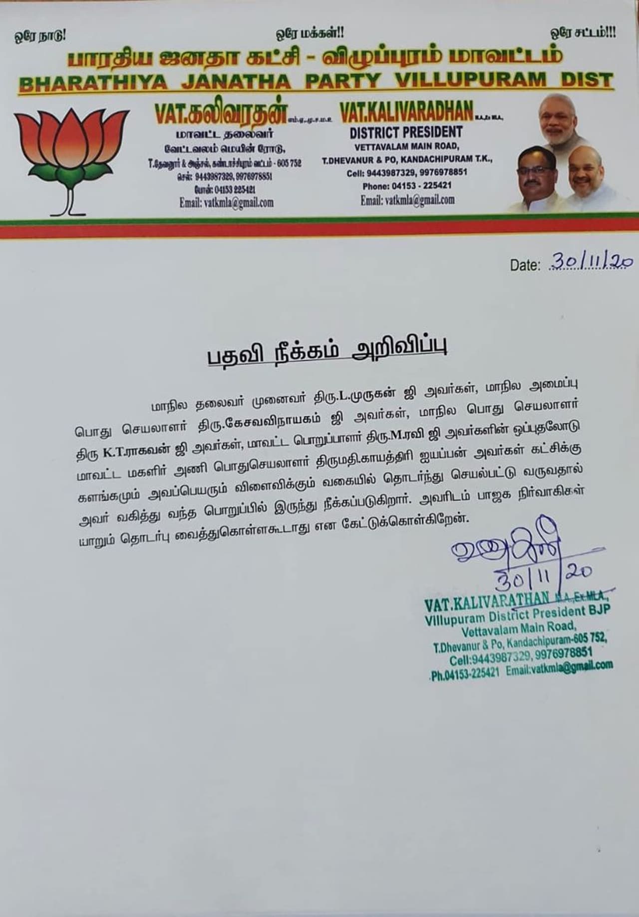 இதுகுறித்து கலிவரதன் நேற்று இரவு வெளியிட்ட அறிவிப்பில்;- பாஜக மாநில தலைவர் எல். முருகன் ஜி, மாநில அமைப்புப் பொதுச் செயலாளர் கேசவ விநாயகம் ஜி, மாநிலப் பொதுச் செயலாளர் கே.டி.ராகவன் ஜி, மாவட்டப்பொறுப்பாளர் ரவிஜி அவர்களின் ஒப்புதலோடு... மாவட்ட மகளிர் அணி பொதுச் செயலாளர் காயத்ரி கட்சிக்கு அவப்பெயரும், களங்கமும் விளைவிக்கும் வகையில் தொடர்ந்து செயல்பட்டு வருவதால், அவர் வகித்து வந்த பொறுப்பில் இருந்து நீக்கப்படுகிறார். அவரிடம் பாஜக நிர்வாகிகள் யாரும் தொடர்பு வைத்துக் கொள்ளக் கூடாது என கேட்டுக்கொள்கிறேன் என்று குறிப்பிட்டுள்ளார். பாலியல் புகார் சொன்ன பெண்ணை, அவர் யார் மீது புகார் சொன்னாரோ அவரே நீக்கியிருப்பது அரசியல் வட்டாரத்தில் அதிர்வுகளை ஏற்படுத்தியுள்ளது.