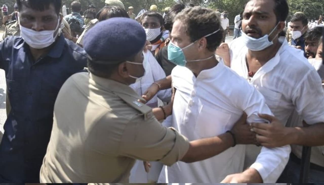 பாதிக்கப்பட்ட பெண்ணின் குடும்பத்தைச் சந்திக்க ஹத்ராஸ் பகுதிக்கு இன்று சென்ற காங்கிரஸ் முன்னாள் தலைவரும், நாடாளுமன்ற உறுப்பினருமான ராகுல்காந்தி மற்றும் பிரியங்கா இருவரும் சென்ற வாகனத்தை காவல்துறையினர் தடுத்து நிறுத்தி உள்ளனர். அதனையடுத்து ராகுல்காந்தி காரிலிருந்து இறங்கி நடைப்பயணமாகச் செல்ல முயன்றபோது, காவல்துறையினர் தடுத்து நிறுத்த முயன்றுள்ளனர். அதனை மீறி புறப்பட்ட ராகுல்காந்தியை சீருடையில் இருந்த உத்திரப் பிரதேச காவல்துறையைச் சேர்ந்தவர்கள் தாக்கிக் கீழே தள்ளி உள்ளனர்.