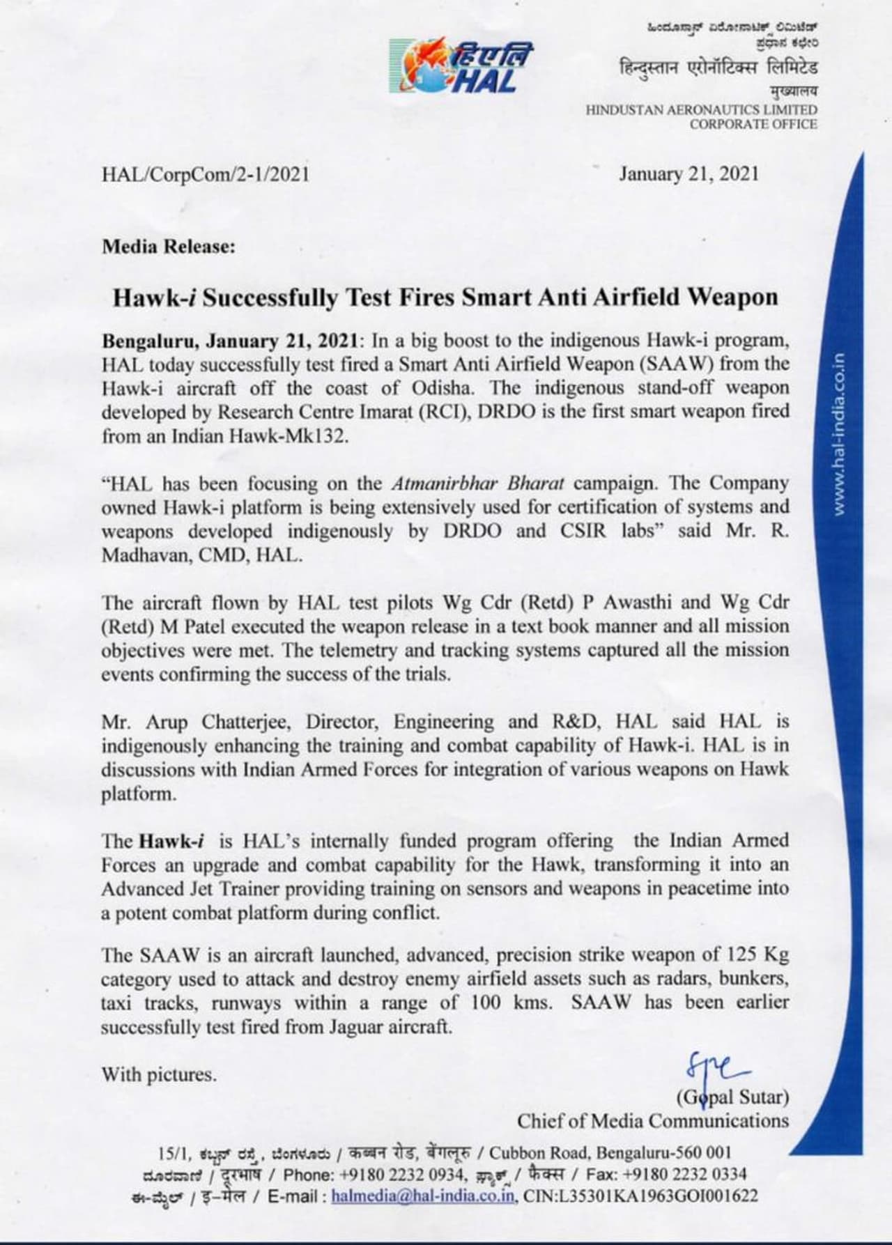 பாதுகாப்பு ஆராய்ச்சி மற்றும் மேம்பாட்டு அமைப்பின் டிஆர்டிஓ ஆராய்ச்சி மையமான Imart (RCI) வடிவமைத்துள்ள விமான எதிர்ப்பு ஆயுதம் (SAAW) முற்றிலும் உள்நாட்டு தொழில்நுட்பத்தில் தயாரிக்கப்பட்ட தாகும். Hawaki - I MK132 என்ற இந்த போர் விமானத்தில் பொருத்தி பரிசோதனை நடத்தப்பட்டது இதுவே முதல் முறையாகும். இந்தியன் ஹாக் எம் கே- 132 பயிற்சி விமானத்தில் இருந்து சுடப்பட்ட முதல் ஸ்மார்ட் ஆயுதம் இதுவாகும். ஹாட் எம்கே 132 போர் விமானம் விமானிகளுக்கு பயிற்சி அளிப்பதற்காக கடந்த 2008 ஆம் ஆண்டில் விமானப் படையில் சேர்த்துக் கொள்ளப்பட்டது ஆகும். விமான பயிற்சியில் ஹாக் விமானங்கள் முக்கிய பங்காற்றி வருவது குறிப்பிடத்தக்கது.